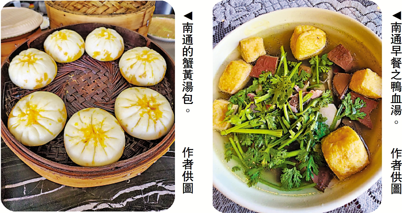 朋友帶我們去江邊的「四海樓」,以前只知道淮安的蟹黃包著名,原來蟹黃包也是南通名物。古色古香的建築,入門就見蟹黃包的檔位,廚娘不停手地做蟹黃包。包子分大小兩種,收口處捏十三個褶子,甚為工整,皮薄而不破,幾乎看到裏面的蟹黃,令人垂涎三尺,包子包着的蟹黃濃湯,味鮮而不膩。對於香港人來說,這分明是頓食之不忘的富貴早餐,但在南通卻是百姓平常之事,真的是太幸福了。
