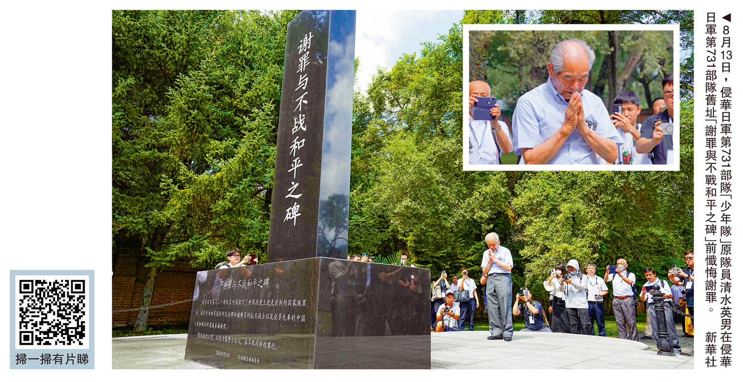 「我向中國的受害者表示真誠的道歉、謝罪!」藍天白雲之下,黑色理石的「謝罪與不戰和平之碑」前,94歲的原侵華日軍第731部隊成員清水英男雙手合十,為中國受害者祈福,深深鞠躬,向中國受害者道歉懺悔。時隔79年,重返哈爾濱曾服役的第731部隊舊址,清水英男希望通過自己個人的懺悔道歉行動,喚起更多人的反思和警醒,珍惜來之不易的和平,避免戰爭悲劇重演。\大公報記者 于海江、王欣欣