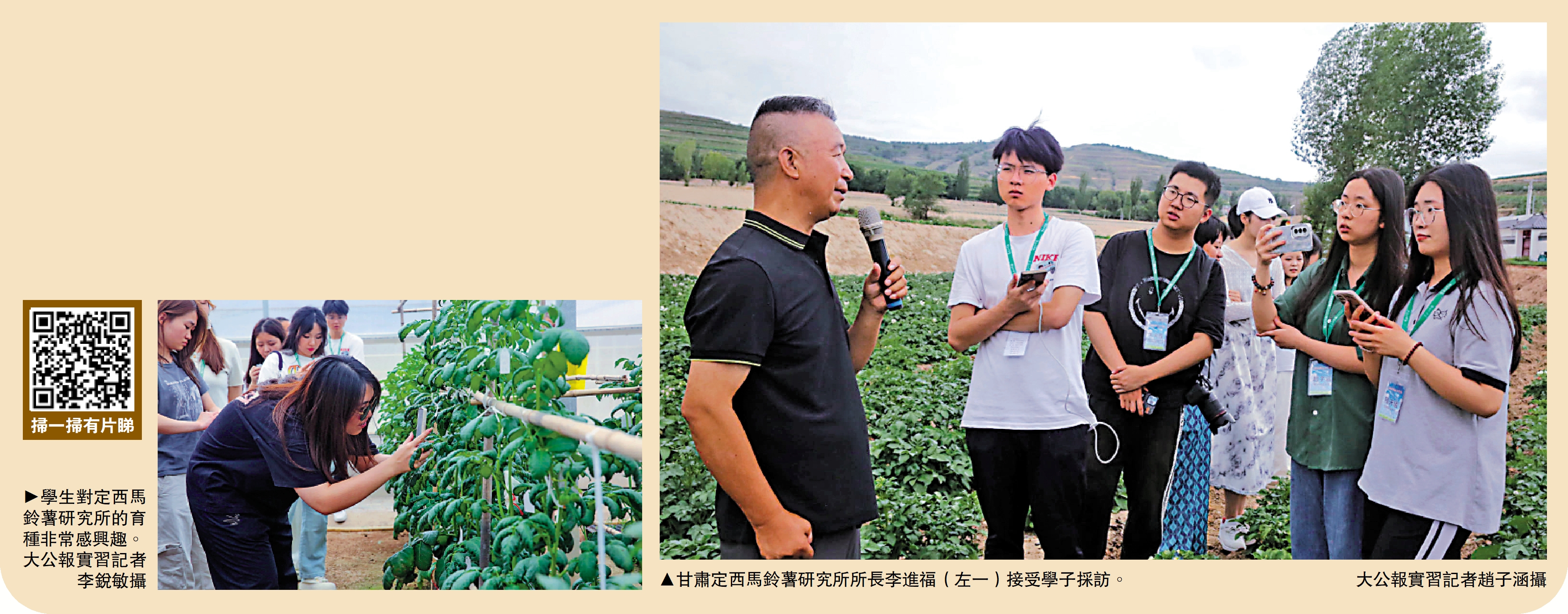 隨着甘肅麻辣燙的爆火,其中的定西寬粉也受到人們的一致好評,作為原材料的定西馬鈴薯也隨之火爆「出圈」。7月21日,隴港學子來到被稱為「中國薯都」的甘肅定西,走進定西馬鈴薯研究所,不僅深入了解了一顆馬鈴薯從「原原種」到「原種」,再到商品薯「進化」的全過程,同時更親身感受和見證了中國農業科技工作者幾十年如一日培育馬鈴薯良種的艱辛付出,以及所取得的巨大成就。\大公報實習記者 趙子涵、種天儀