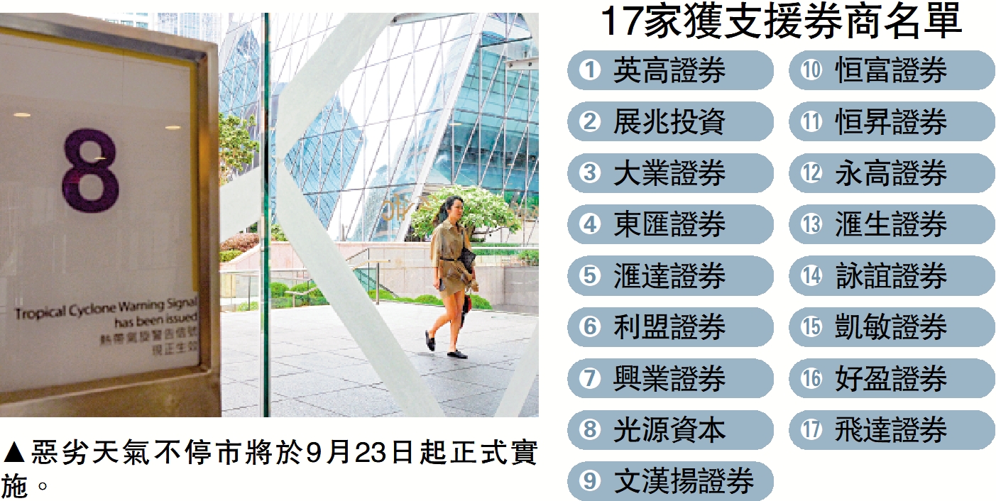 【大公報訊】惡劣天氣不停市將於9月23日起實施,港交所(00388)昨日公布惡劣天氣交易需支援的17間券商名單。據了解,這17家券商將獲豁免遵守若干規定。
