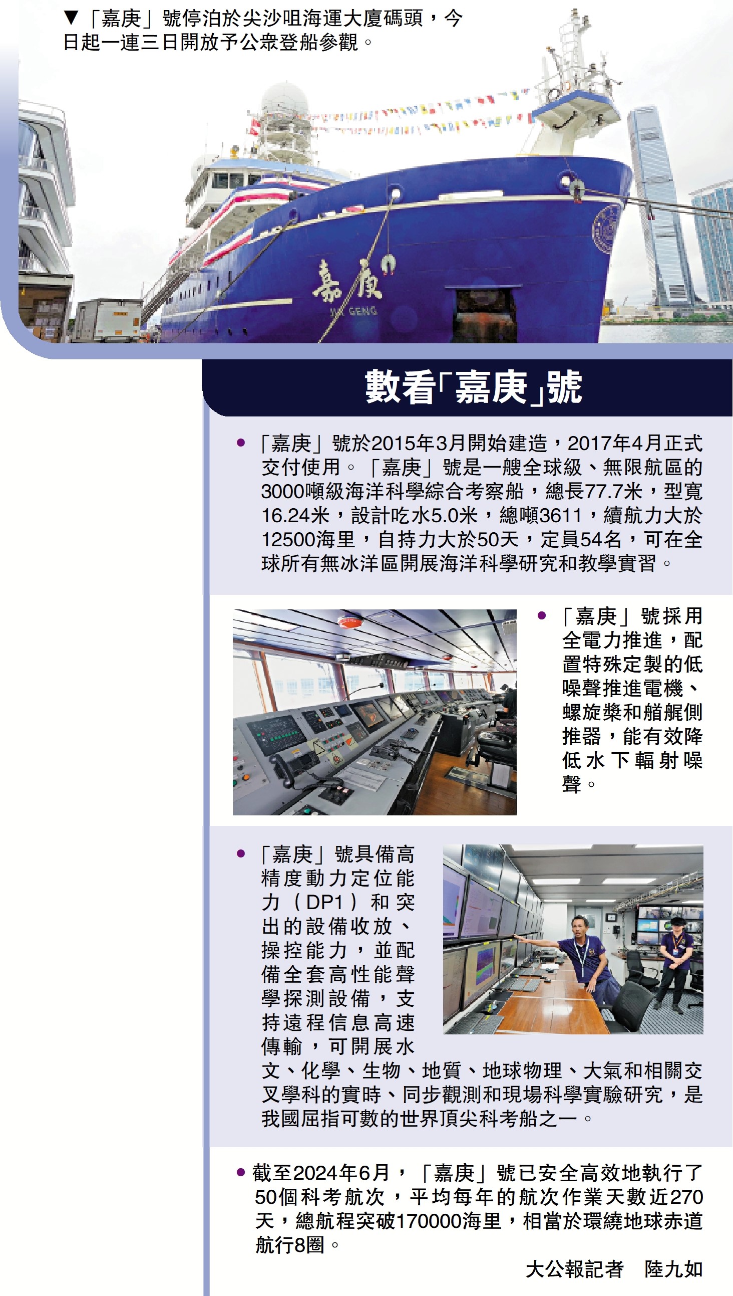 •截至2024年6月,「嘉庚」號已安全高效地執行了50個科考航次,平均每年的航次作業天數近270天,總航程突破170000海里,相當於環繞地球赤道航行8圈。