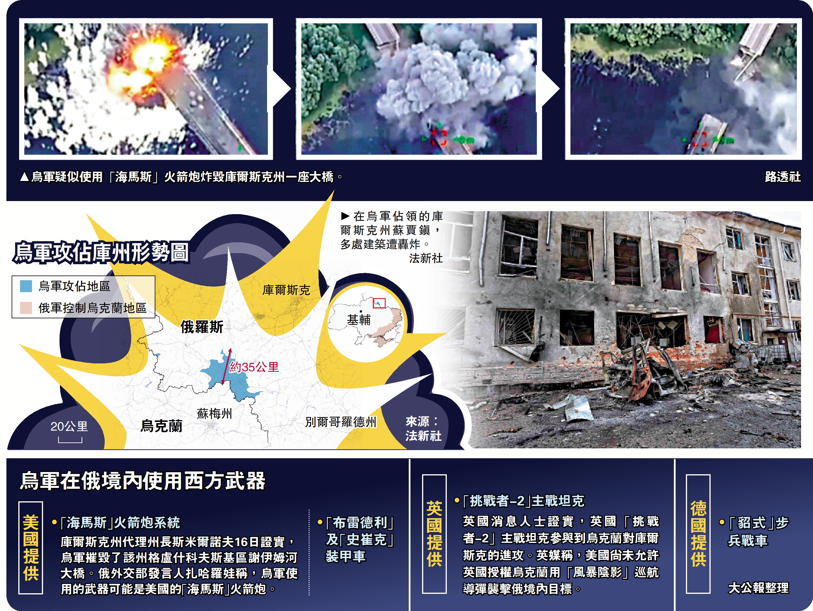 基輔宣稱,烏軍自本月6日以來已在庫州拿下82個居民點,佔領土地面積超過1100平方公里。除可能使用了美製「海馬斯」外,有消息稱,包括「布雷德利」裝甲車、「史崔克」裝甲車以及德國提供的「貂式」步兵戰車等西式武器,都在俄境內出現。