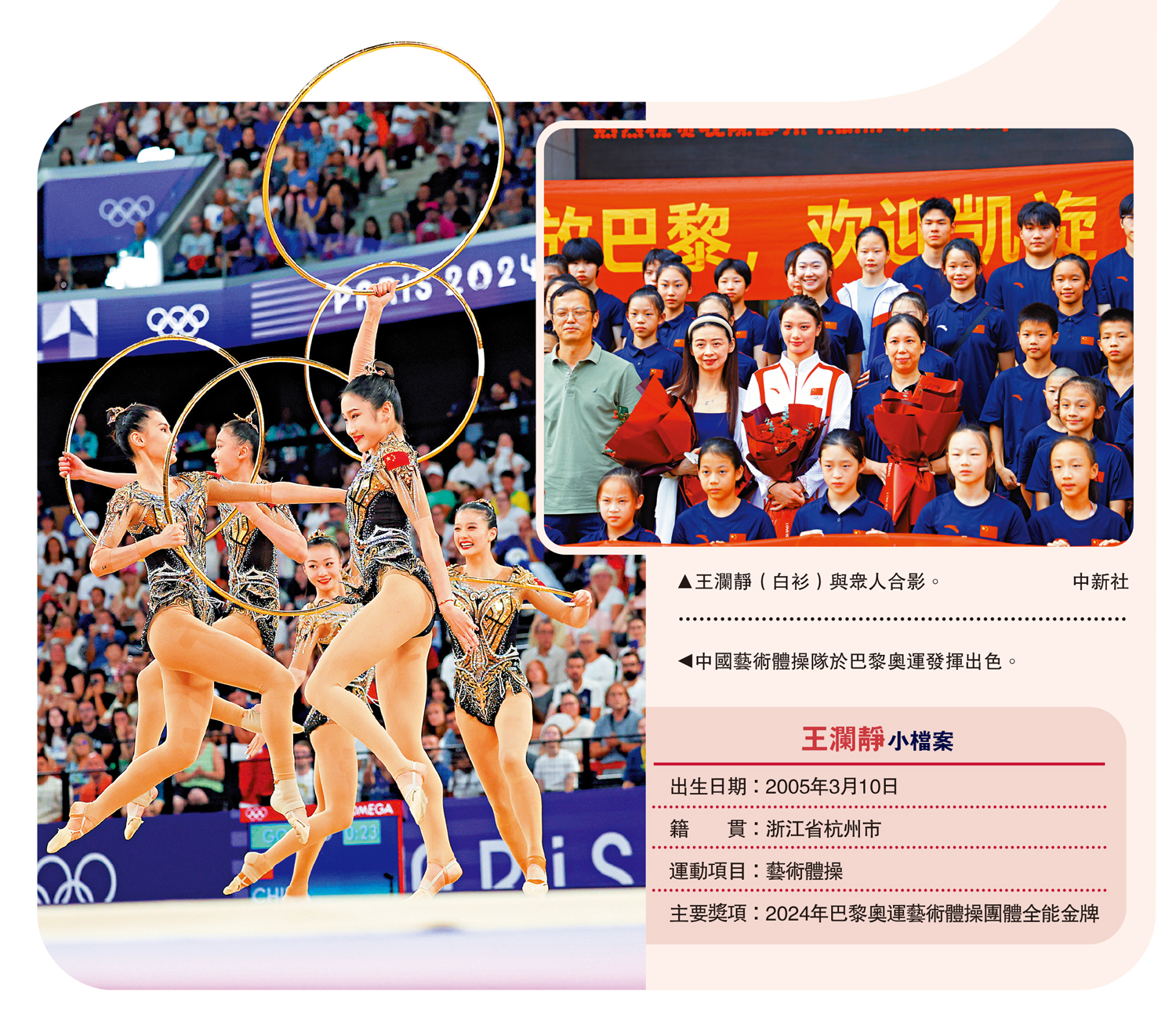 【大公報訊】據中新網報道:巴黎當地時間10日進行的藝術體操團體全能項目決賽中,由郭崎琪、郝婷、黃張嘉洋、王瀾靜和丁欣怡組成的中國藝術體操隊發揮穩定,以總分69.800分的優異成績摘得金牌,取得歷史性突破,並打破了歐洲隊伍對這個項目的長期壟斷。「已經激動到無法用語言形容了,完全不敢相信,就像做夢一樣。」王瀾靜回憶。