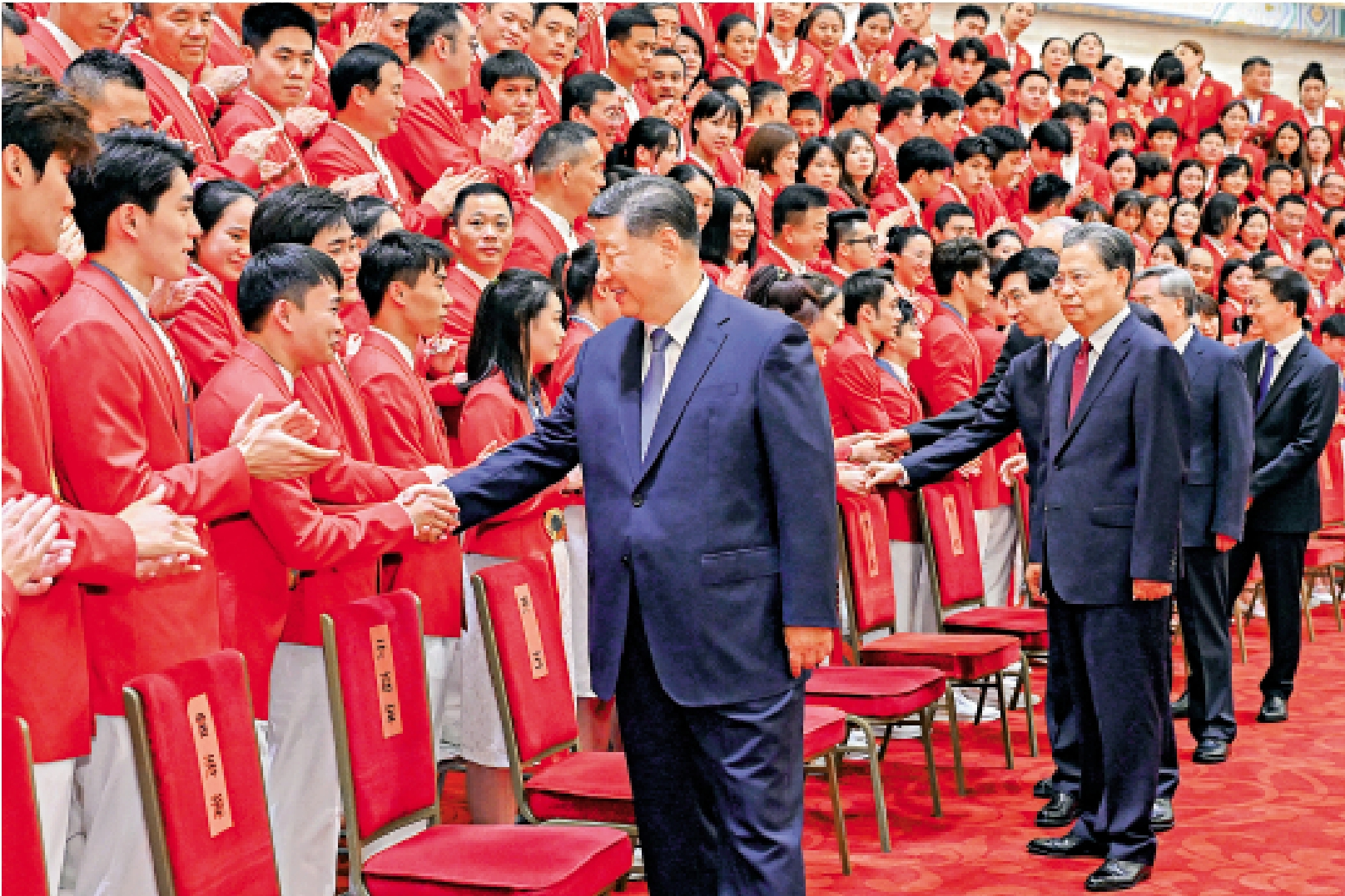 中國體育代表團20日中午在國家體育總局集結,集體乘車赴人民大會堂參加表彰大會。記者到達國家體育總局門口時看到,大門兩旁以及天橋之上人頭攢動,粉絲們有的手持禮物,有的拿着照片,有的揮動條幅,希望有機會能夠見到自己喜歡的運動員。當孫穎莎、樊振東、汪順等備受矚目的運動員出現時,人群瞬間沸騰,歡呼聲此起彼伏。粉絲們來回走動以尋找最佳的拍攝機位,不願錯過任何一個與偶像近距離接觸的機會。一位早上剛到體育總局門口的小朋友就幸運見到了鄭欽文,獲得珍貴簽名。她不斷展示着鄭欽文在她衣服上留下的簽名,臉上露出驕傲的喜悅。