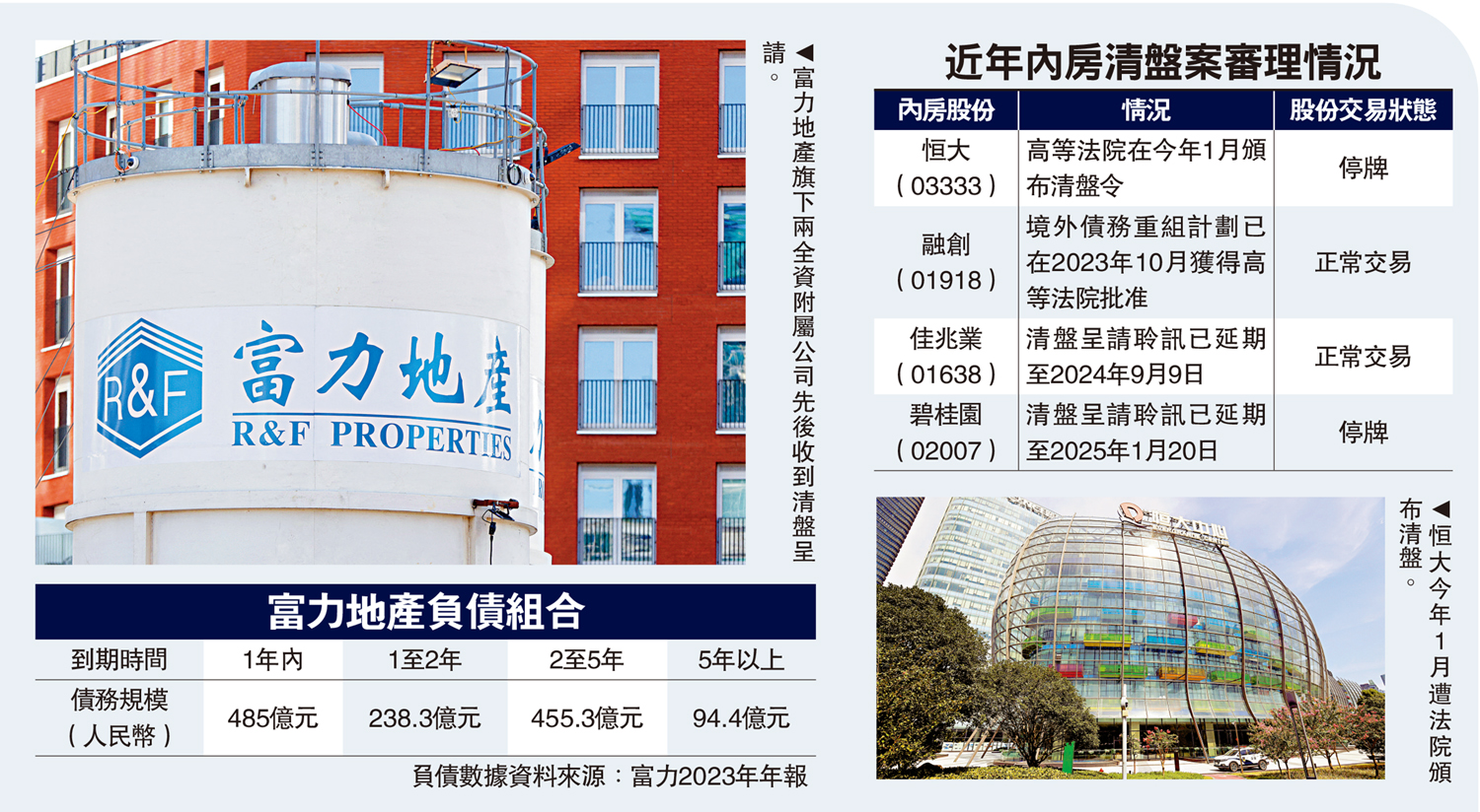 再有內房企業被入稟清盤。富力地產(02777)披露,旗下兩全資附屬公司先後收到清盤呈請,案件將分別在高等法院審理。富力董事會表示,呈請人持有貸款僅佔未償還本金額的18%,並不代表相關持份者的利益。\大公報記者 蔣去悄