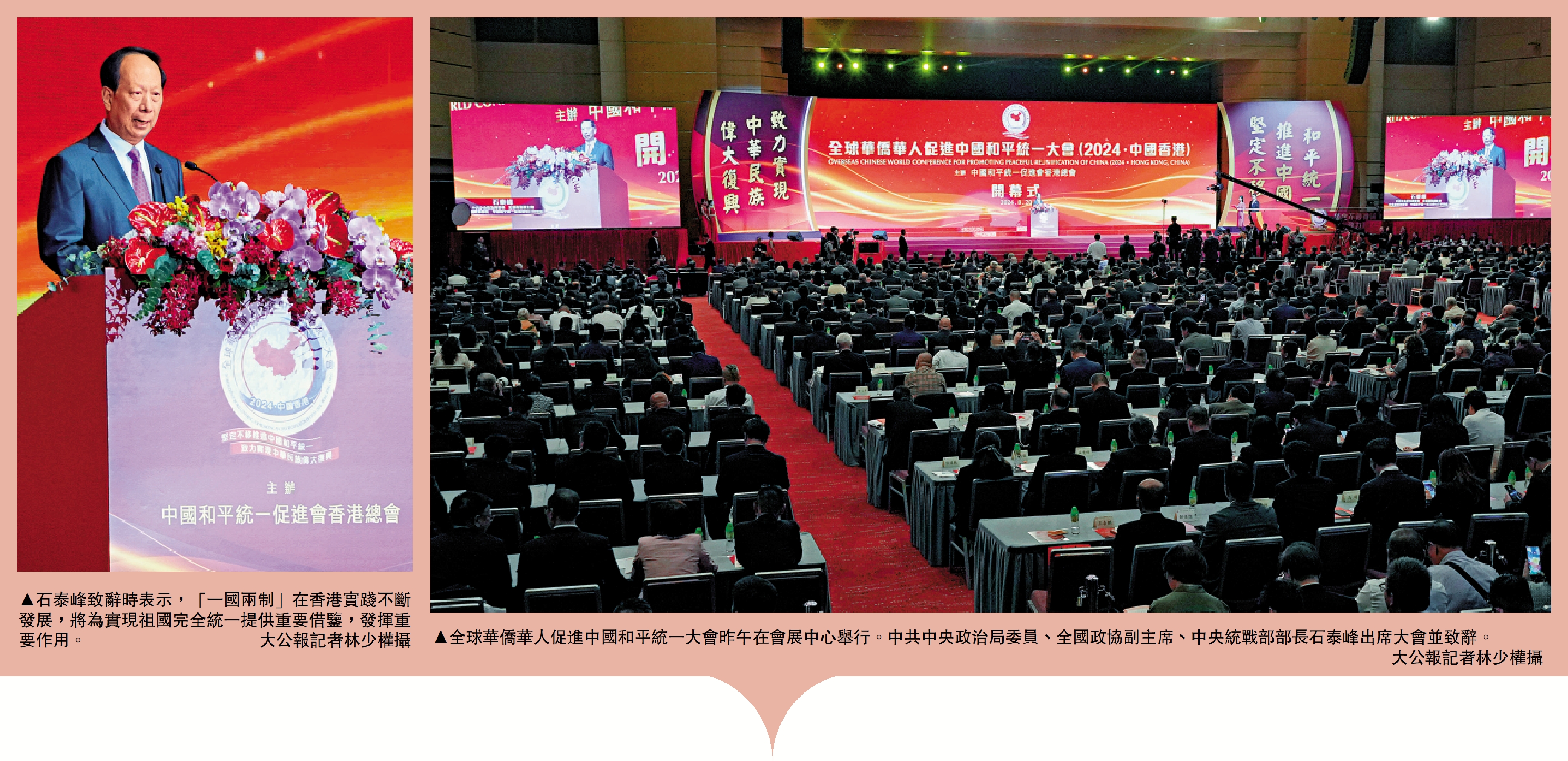 全球華僑華人促進中國和平統一大會昨日下午在香港會展中心隆重舉行。中共中央政治局委員、全國政協副主席、中央統戰部部長石泰峰出席大會並致辭表示,「一國兩制」在香港實踐不斷發展,將為實現祖國完全統一提供重要借鑒,發揮重要作用。