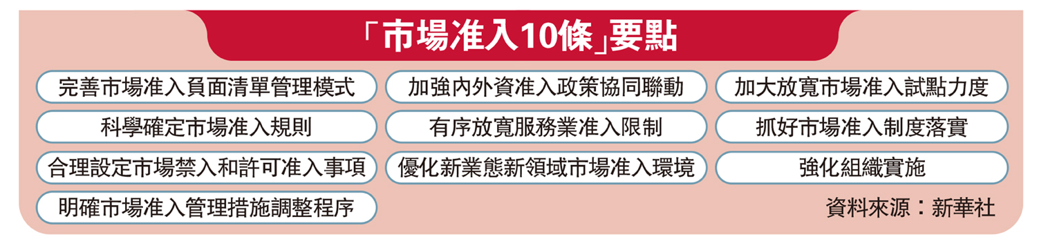 【大公報訊】記者海巖北京報道:中共二十屆三中全會明確要求,完善市場准入制度,優化新業態新領域市場准入環境。中共中央辦公廳、國務院辦公廳21日發布《關於完善市場准入制度的意見》,這是中央層面首次專門就市場准入制度建設出台政策文件,被稱為「市場准入10條」。意見提出,有序放寬服務業准入限制,聚焦生命健康、新型能源、人工智能等10個新業態新領域優化市場准入環境,積極擴大數字產品市場准入,積極參與國際市場准入規則和標準制定等。