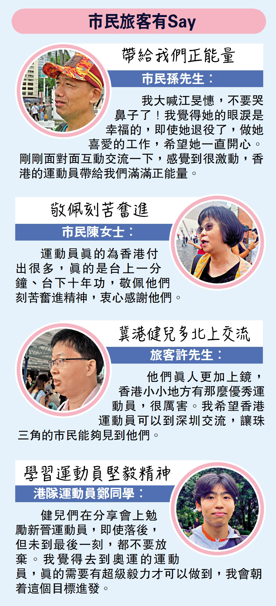 市民孫先生:我大喊江旻憓,不要哭鼻子了!我覺得她的眼淚是幸福的,即使她退役了,做她喜愛的工作,希望她一直開心。剛剛面對面互動交流一下,感覺到很激動,香港的運動員帶給我們滿滿正能量。