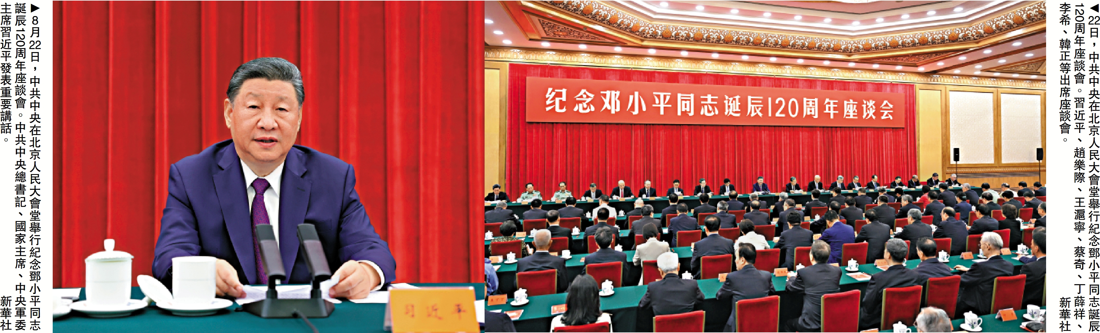 中共中央22日上午在人民大會堂舉行座談會,紀念鄧小平同志誕辰120周年。中共中央總書記、國家主席、中央軍委主席習近平發表重要講話。他強調,鄧小平同志是全黨全軍全國各族人民公認的享有崇高威望的卓越領導人,偉大的馬克思主義者,偉大的無產階級革命家、政治家、軍事家、外交家,久經考驗的共產主義戰士,黨的第二代中央領導集體的核心,中國社會主義改革開放和現代化建設的總設計師,中國特色社會主義道路的開創者,鄧小平理論的主要創立者,為世界和平和發展作出重大貢獻的偉大國際主義者。他對黨、對人民、對國家、對民族、對世界作出了突出貢獻,功勳彪炳史冊、永勵後人。
