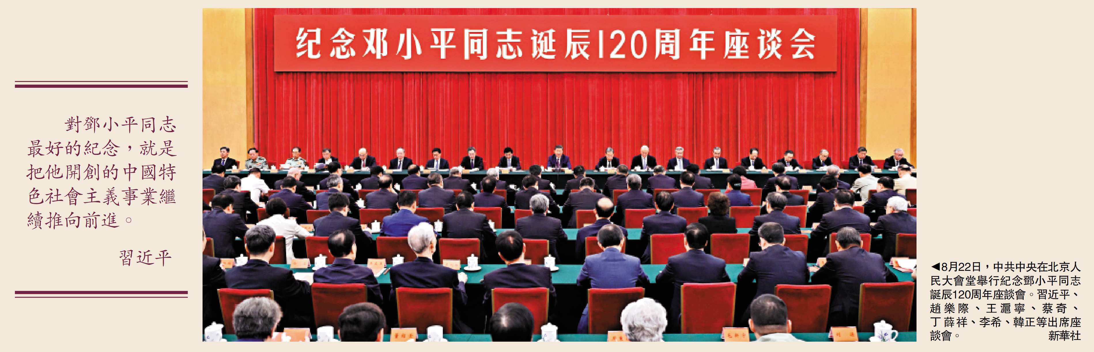 【大公報訊】據新華社報道:中共中央22日上午在人民大會堂舉行座談會,紀念鄧小平同志誕辰120周年。中共中央總書記、國家主席、中央軍委主席習近平發表重要講話。他強調,鄧小平同志是全黨全軍全國各族人民公認的享有崇高威望的卓越領導人,偉大的馬克思主義者,偉大的無產階級革命家、政治家、軍事家、外交家,久經考驗的共產主義戰士,黨的第二代中央領導集體的核心,中國社會主義改革開放和現代化建設的總設計師,中國特色社會主義道路的開創者,鄧小平理論的主要創立者,為世界和平和發展作出重大貢獻的偉大國際主義者。他對黨、對人民、對國家、對民族、對世界作出了突出貢獻,功勳彪炳史冊、永勵後人。