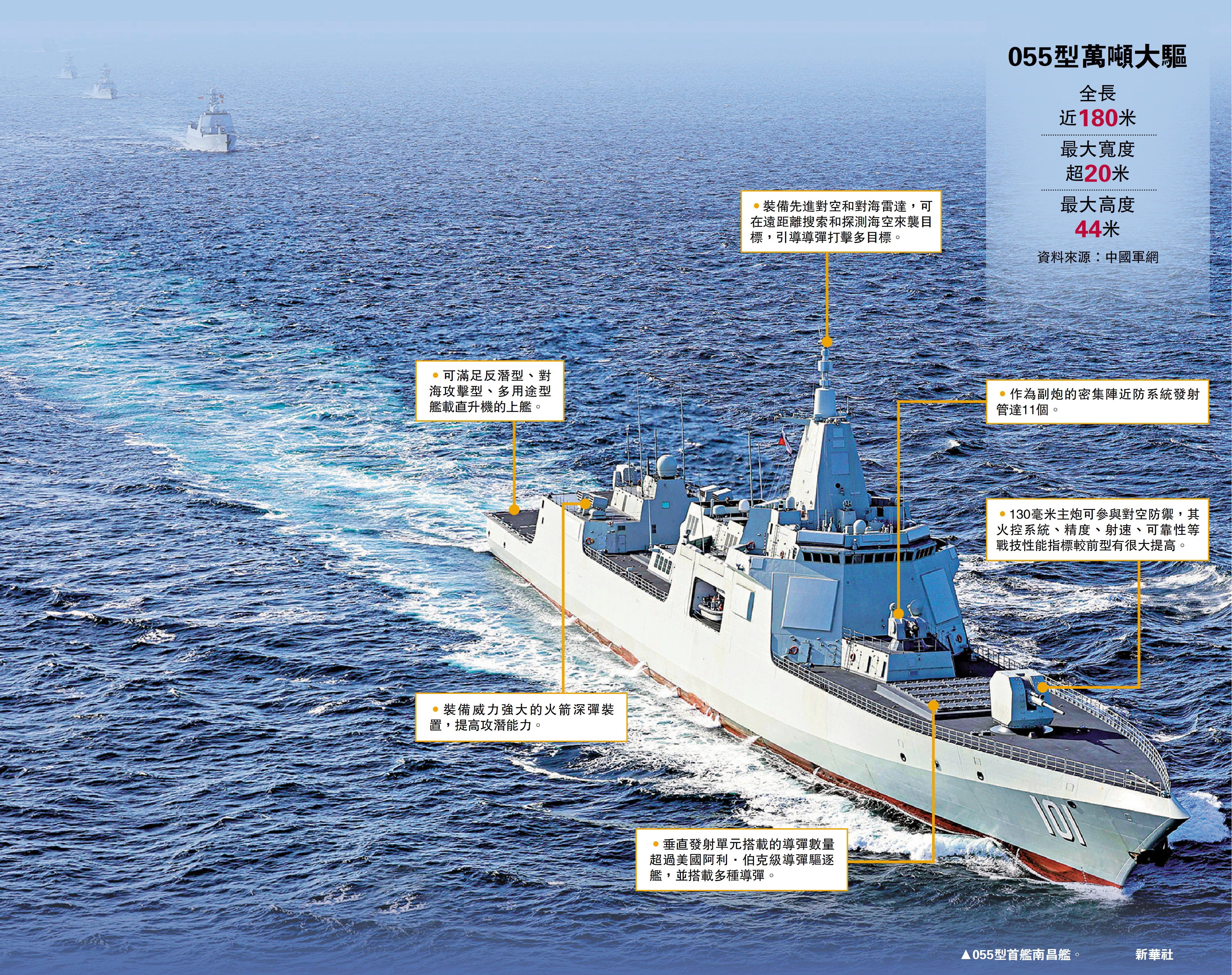 央視「國防軍事頻道」日前報道,海軍055型萬噸級驅逐艦是新質作戰力量的代表。新質作戰力量從傳統的陸海空作戰領域,向遠海、極地、網絡、電磁等新戰域擴展。海軍南昌艦上校凌雪接受央視採訪時總結指出,055型艦是航母編隊整體作戰能力的倍增器。第一方面是擔任航母編隊的預備指揮所;第二方面是為航母編隊提供區域防空的能力;第三方面是加強反潛能力,為航母可以「走得更遠、打得更遠、看得更遠」提供支持保障。