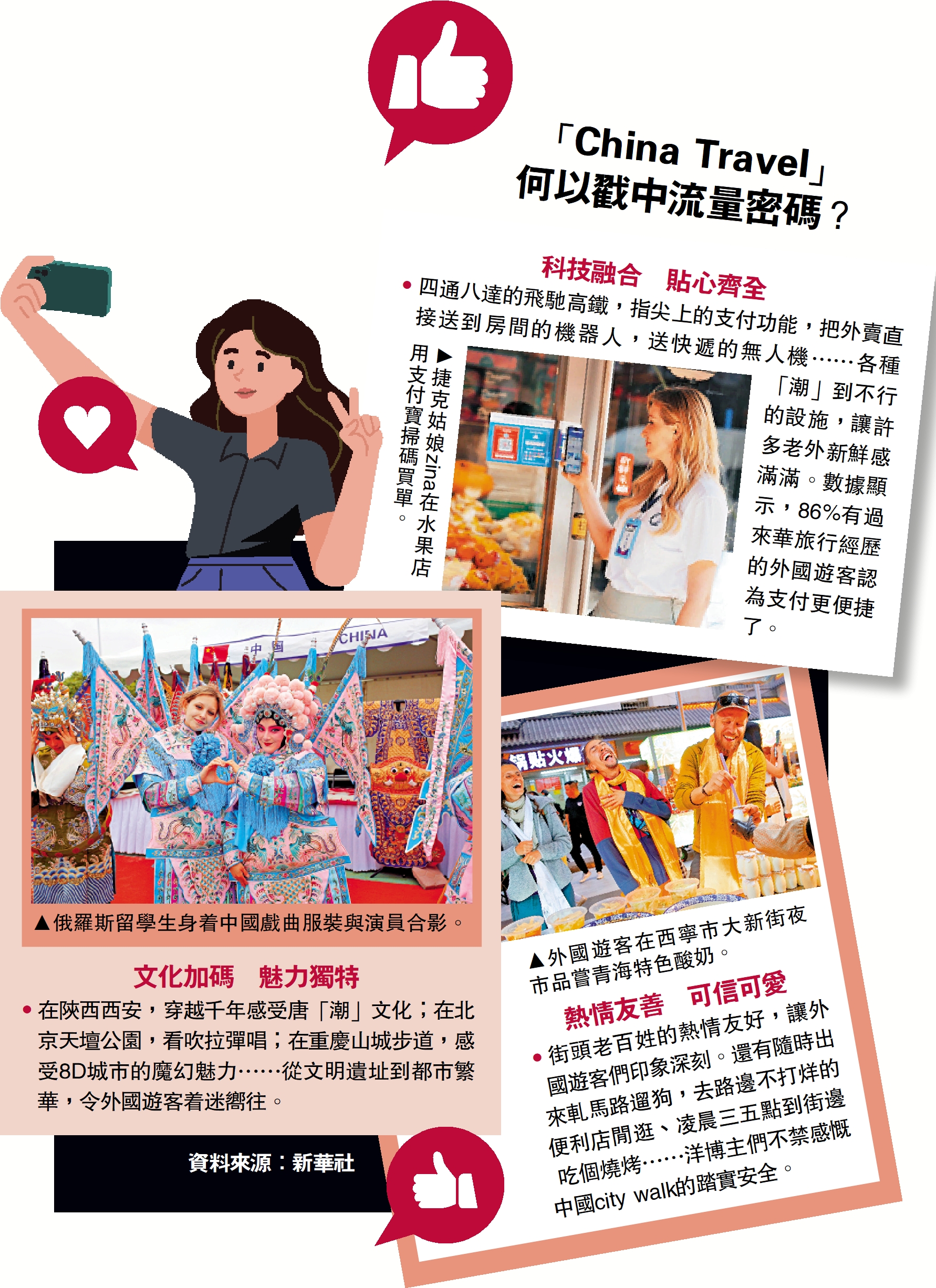 •在陝西西安,穿越千年感受唐「潮」文化;在北京天壇公園,看吹拉彈唱;在重慶山城步道,感受8D城市的魔幻魅力……從文明遺址到都市繁華,令外國遊客着迷嚮往。