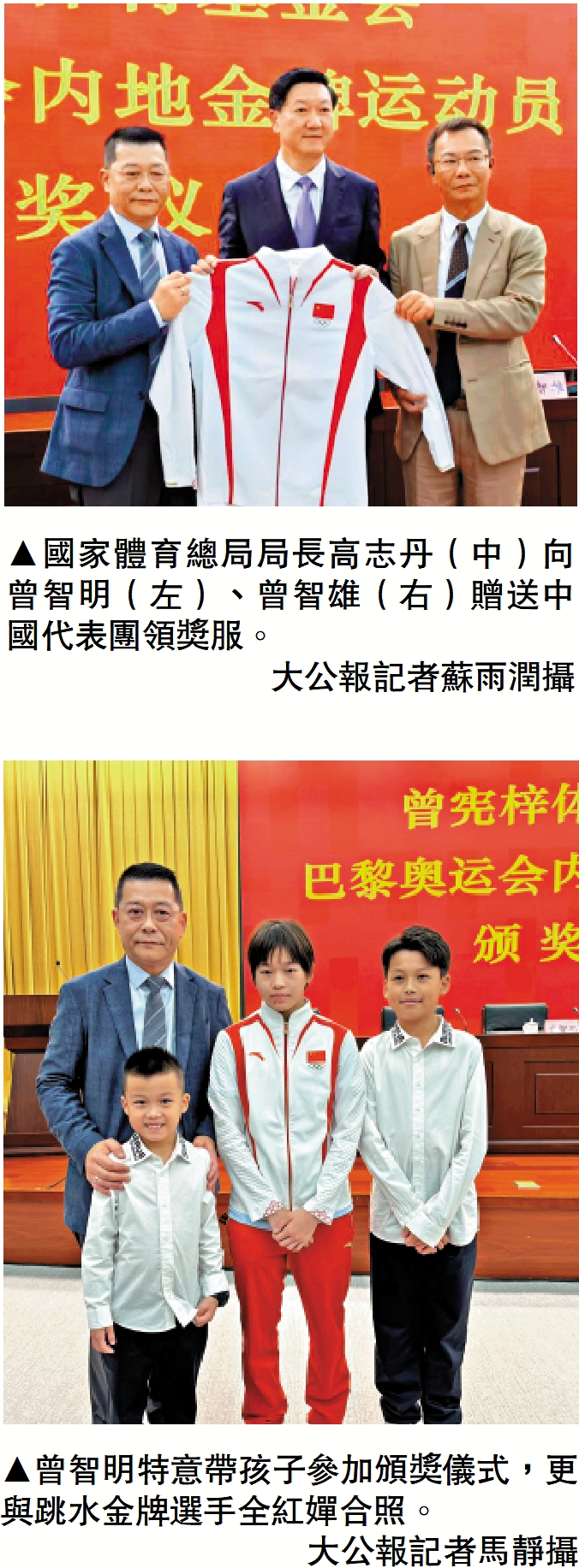 【大公報訊】記者馬靜、李暢、蘇雨潤北京報道:曾憲梓體育基金會理事長曾智明在頒獎儀式上,向在座的金牌運動員分享了父親曾憲梓的愛國情懷和奧運情結。曾智明動情地說,父親一直強調是黨和國家培養了他,故立志要回報祖國,叮囑後人也要熱愛祖國,要盡自己所能,終身回報國家。