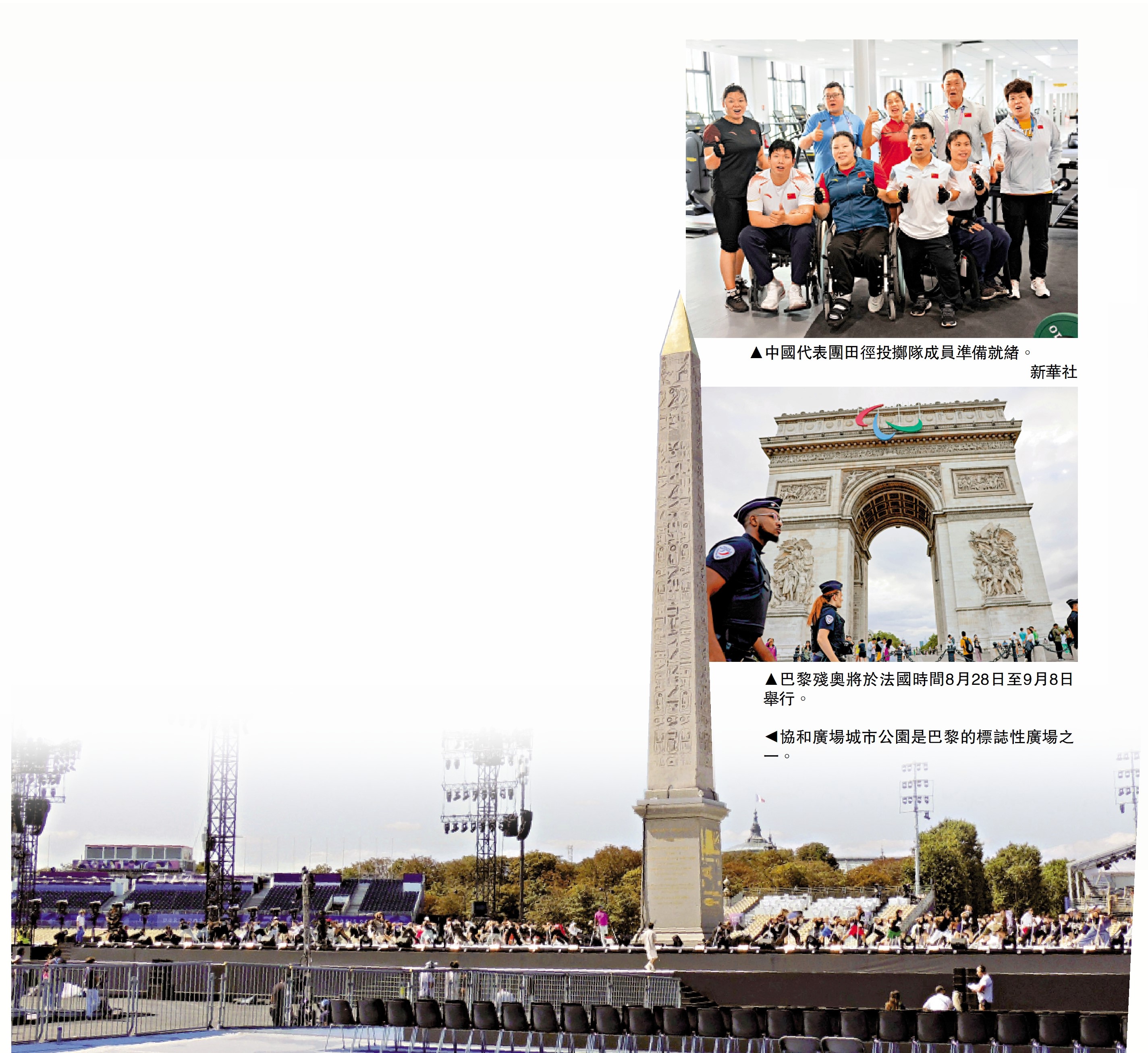 第17屆巴黎殘奧會將於香港時間明天(29日)凌晨2時在巴黎揭幕。本屆殘奧開幕式將破天荒離開體育場,在著名地標香榭麗舍大道與協和廣場城市公園進行。屆時,各代表團將以遊行形式由香榭麗舍大道入場,抵達終點協和廣場城市公園,與沿途6萬5000名觀眾共同歡慶殘奧開幕。另外,除了傳統儀式和藝術表演外,官方入場儀式在協和廣場城市公園舉行。開幕式藝術總監喬利表示,這場盛會將展示殘奧運動員及他們所體現的價值觀。\大公報記者 張銳