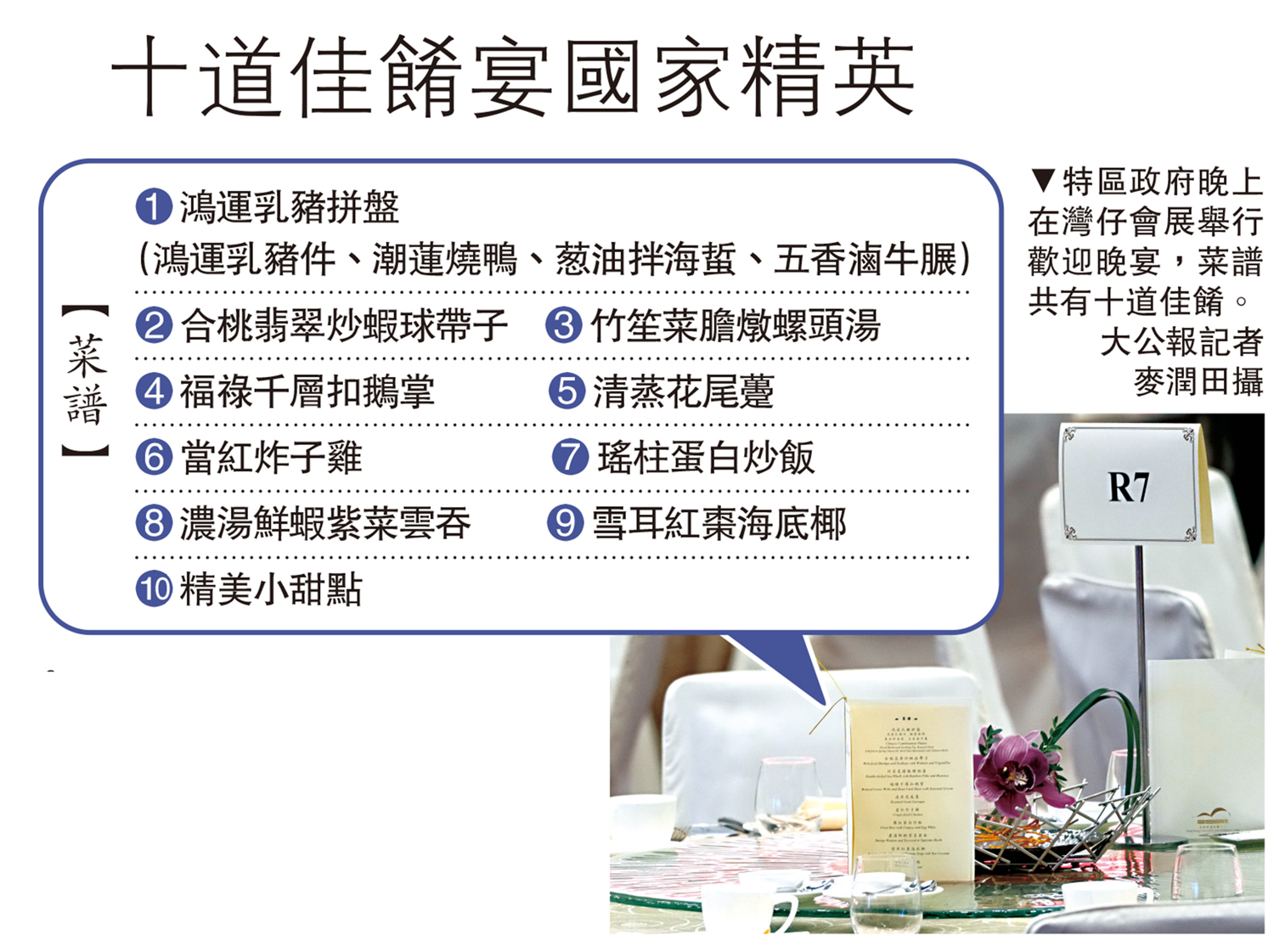 晚宴筵開約40席,每席擺放晚宴菜單,主要為中式菜品,包括鴻運乳豬拼盤、合桃翡翠炒蝦球帶子、竹笙菜膽燉螺頭湯、福祿千層扣鵝掌、清蒸花尾躉、當紅炸子雞、瑤柱蛋白炒飯、濃湯鮮蝦紫菜雲吞、雪耳紅棗海底椰及精美小甜點。