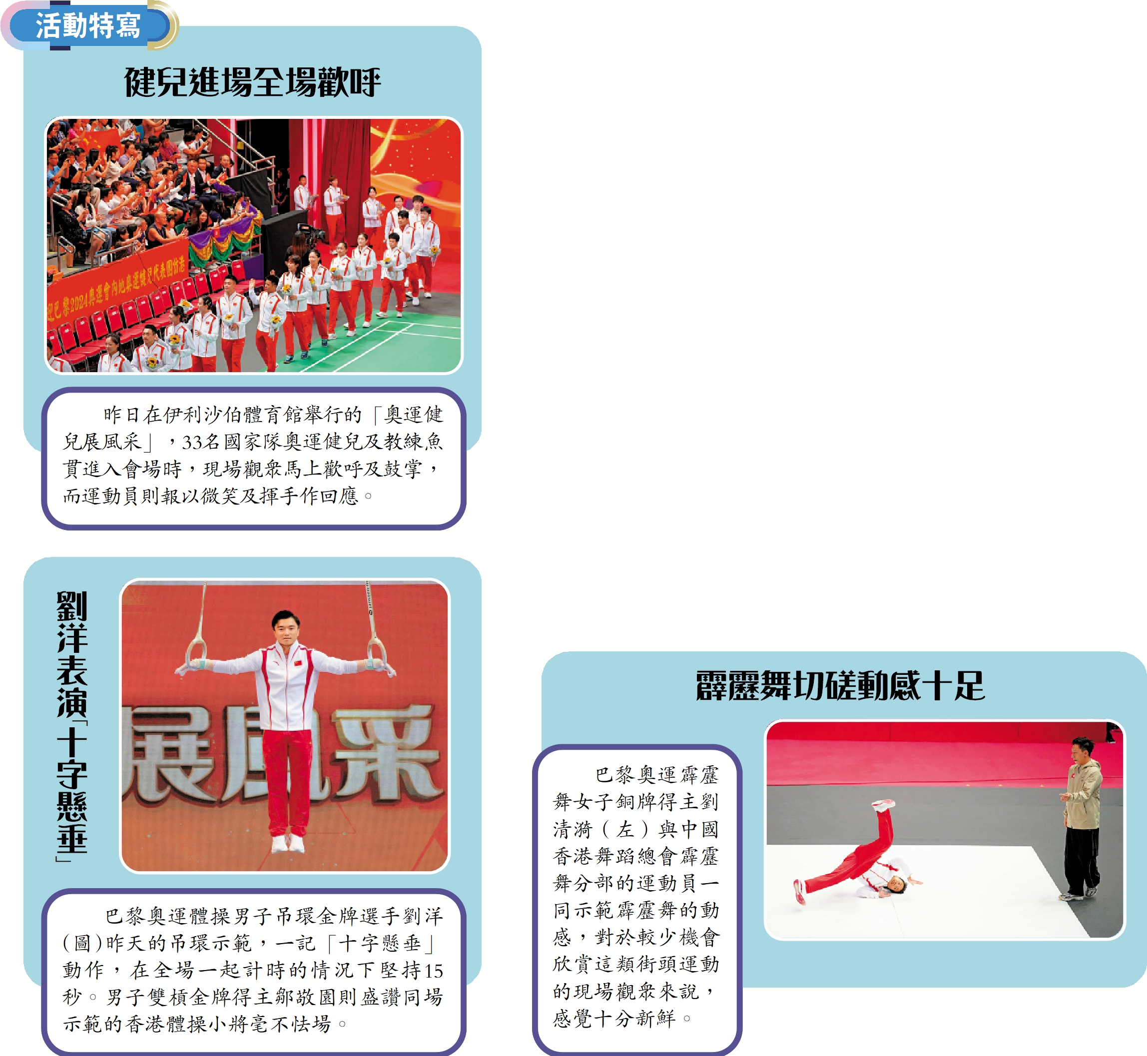巴黎奧運體操男子吊環金牌選手劉洋(圖)昨天的吊環示範,一記「十字懸垂」動作,在全場一起計時的情況下堅持15秒。男子雙槓金牌得主鄒敬園則盛讚同場示範的香港體操小將毫不怯場。