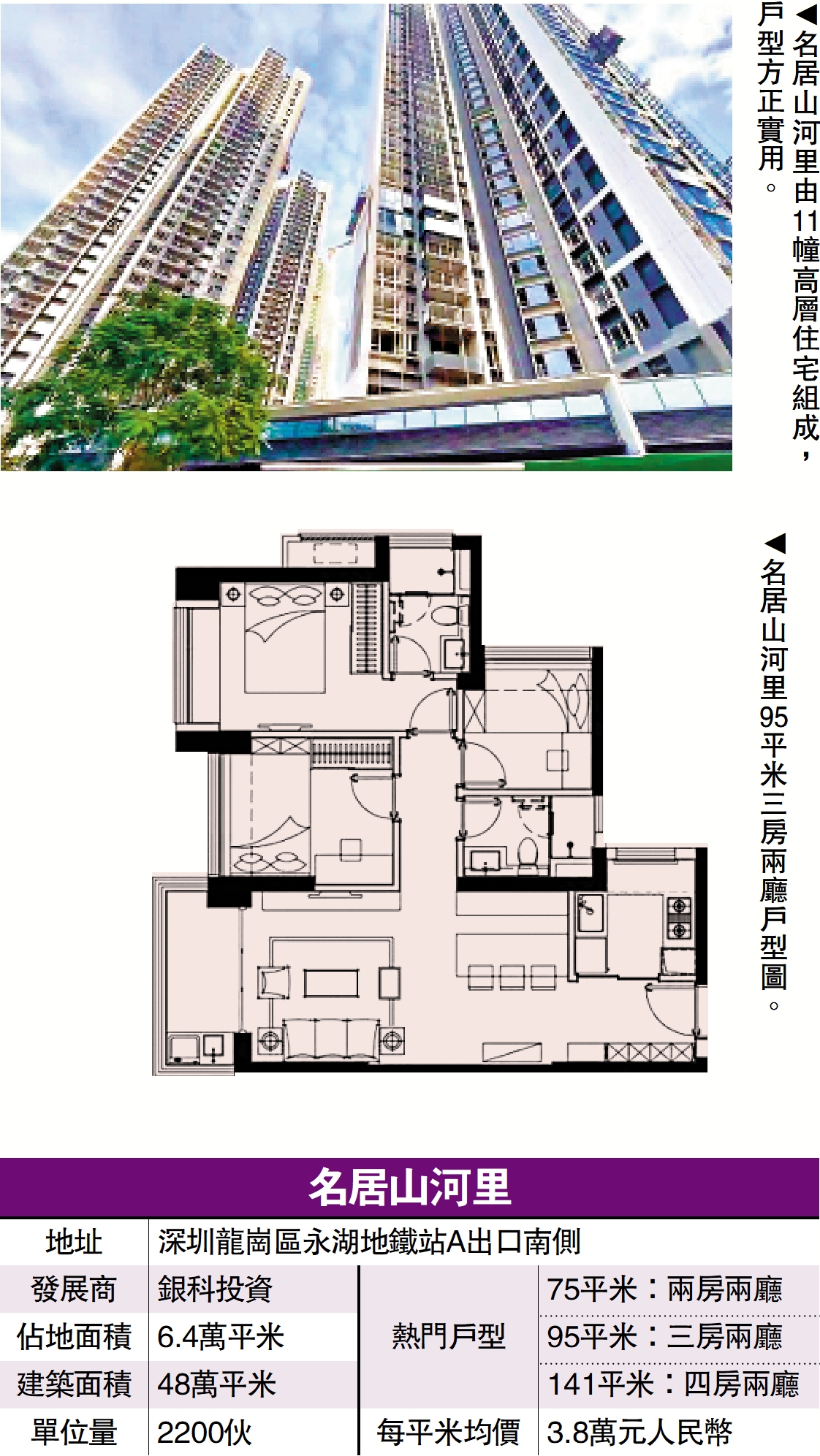 名居山河里為地處橫崗街道永湖地鐵站附近的新盤,佔地6.4萬平米,建築面積48萬平米,共計11幢樓,提供2200伙,戶型多元化,包括75平米兩房,95至102平米三房和116至141平米四房,方正實用,南北通透,其中四房空間開揚,採光度極佳。項目毛坯房每平米均價3.8萬元人民幣。