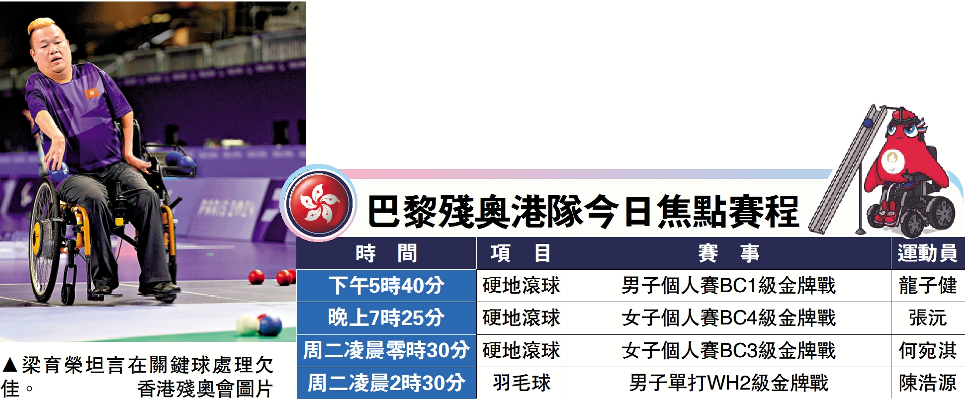 【大公報訊】巴黎殘奧會中國香港硬地滾球代表梁育榮,在昨天的男子個人賽BC4級8強不敵英國的麥佳亞而無緣獎牌。梁育榮賽後表示自己在關鍵球的處理不夠好,希望之後在雙人賽的表現會有改善。