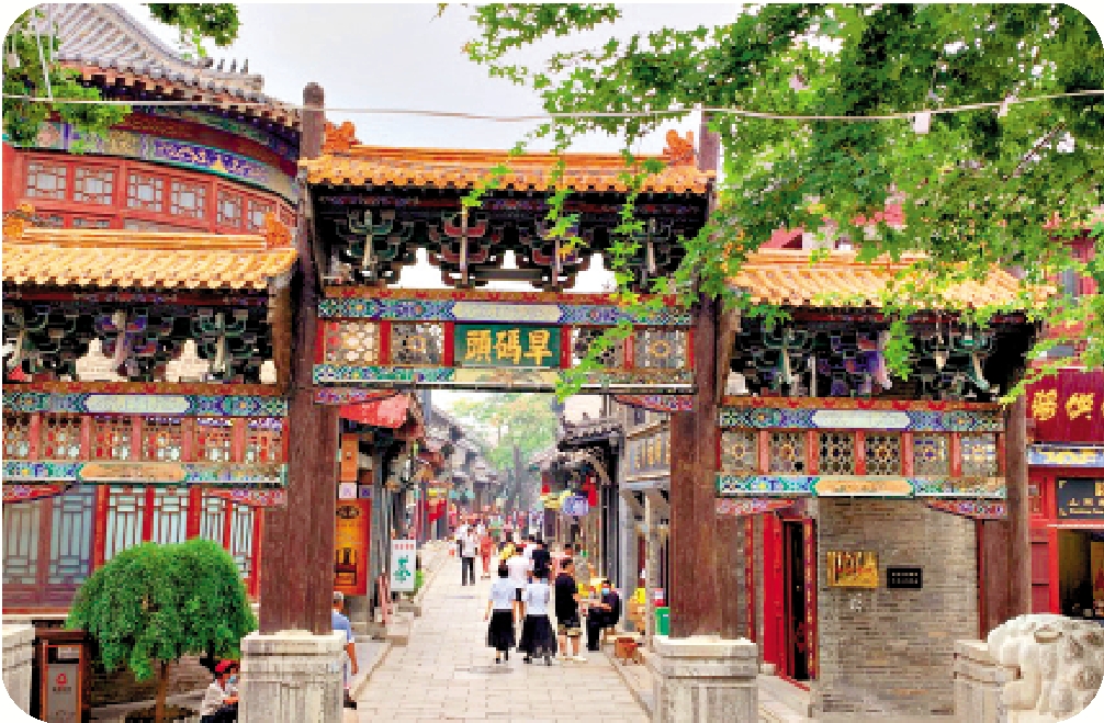 沿着古街往前走,大街兩旁的明清建築,一律是老式門匾,沒有現代的材質和時尚的裝飾,長街短巷、黛瓦灰牆、店舖林立、青石板、老字號、舊牌樓、馬車、轎子、書局、酒肆、客棧、染坊、票號、銀號、綢布莊……家家古香古色,處處懸燈結綵。恍惚中又彷彿聽到自遙遠的地方傳來商城繁華的喧囂聲,而且昔日商賈雲集的影子也仍依稀可見。