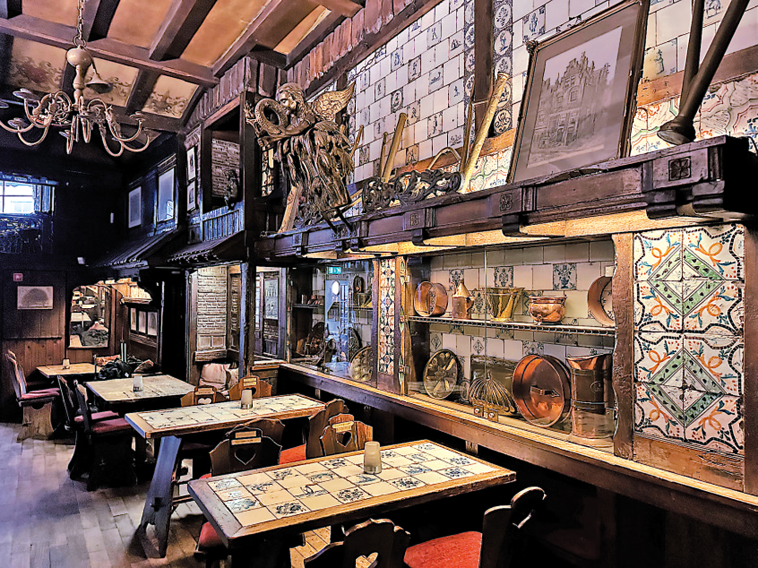 邁進餐廳的一剎那,彷彿推開了穿越「荷蘭黃金時代」的時空之門。和倫勃朗故居如出一轍的木結構內飾、代爾夫特白磁貼磚穿插着鑲嵌在牆壁上、與維米爾畫中室內的同款黑白地磚、靜物畫和風景畫裝點着每一個私密空間、架子上成排的木雕、銅盤等擺件,以及牆上懸掛的老地圖……餐廳內的一切細節都和十七世紀荷蘭風俗畫中的場景如出一轍。坐在吱吱作響的老木椅上,舉着僅一頁A4紙的菜單,望着身邊舉着啤酒推杯換盞慕名而來的各國遊客,那一刻,物是人非是具象的。倫勃朗昏暗的燭光、揚·斯蒂恩(Jan Steen)嘈雜的酒桌、克拉拉·皮特爾斯(Clara Peeters)精緻的餐盤……這家餐廳的一切,彷彿都定格在了四百年前那個為鬱金香而瘋狂的時代。唯一變化的,是來用餐的人。