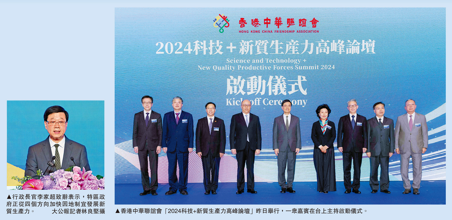 香港特區行政長官李家超致辭表示,特區政府正從四個方向加快因地制宜發展新質生產力,持續加大創新力度,積極推動「政產學研投」五個領域的高效協作。