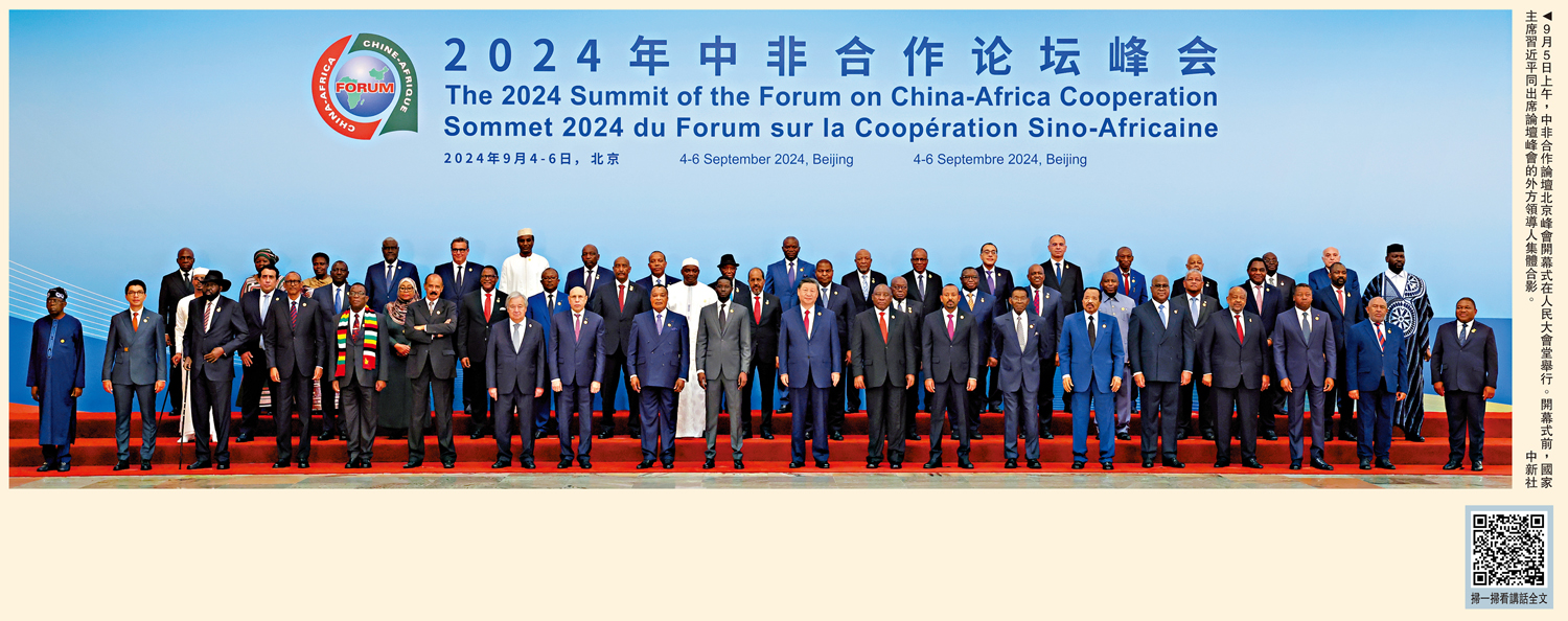 【大公報訊】據新華社報道:初秋北京,高遠澄明。天安門廣場和長安街兩側,鮮艷的五星紅旗同53個非洲國家和非洲聯盟旗幟迎風飄揚。習近平同出席峰會的51位非洲國家元首、政府首腦以及2位總統代表,非盟委員會主席和聯合國秘書長集體合影。在《和平─命運共同體》樂曲和熱烈掌聲中,習近平同外方領導人共同步入會場,在主席台就座。中共中央政治局常委李強、趙樂際、王滬寧、蔡奇、丁薛祥、李希出席。習近平發表題為《攜手推進現代化,共築命運共同體》的主旨講話。