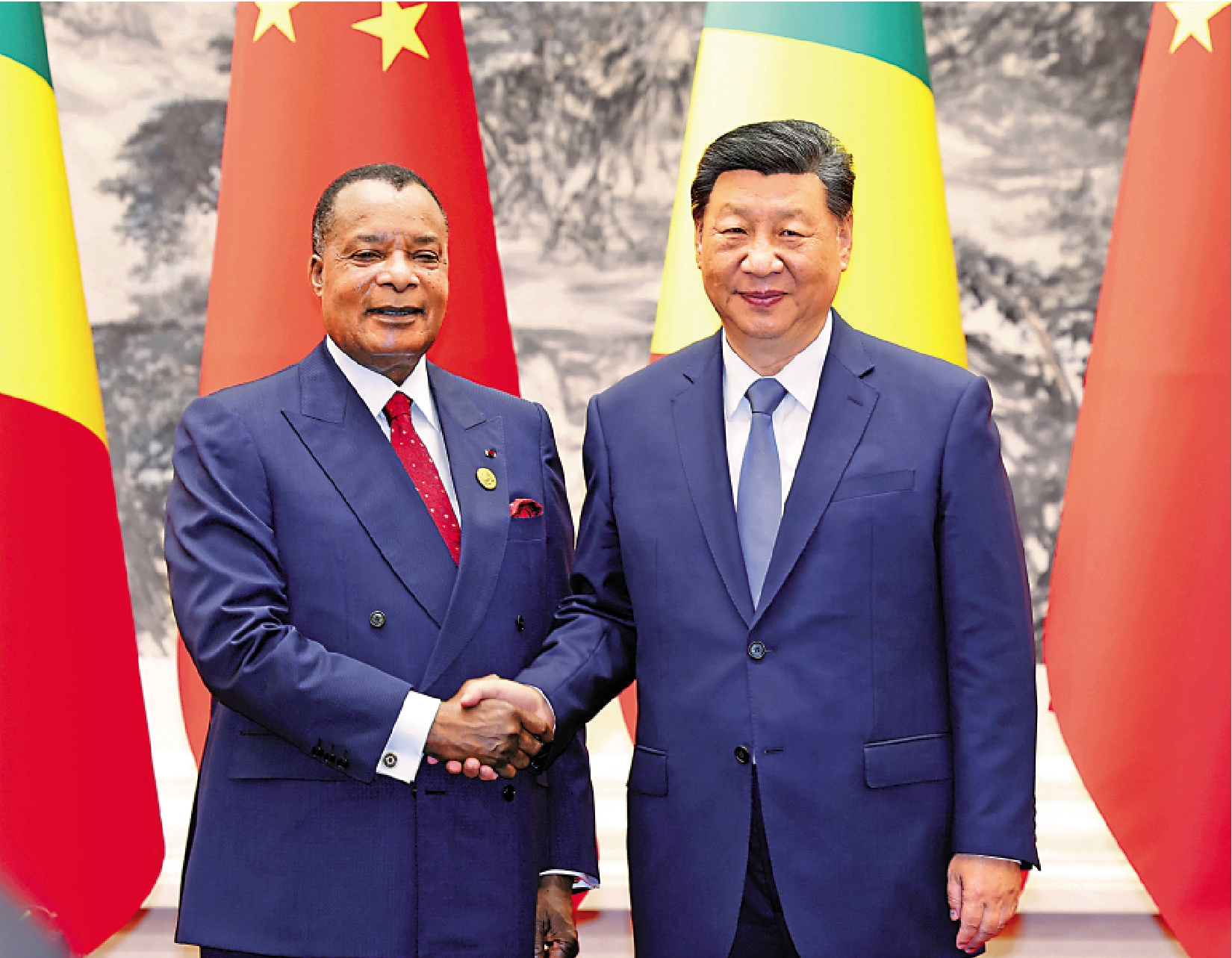 9月6日上午,國家主席習近平在北京人民大會堂同來華出席中非合作論壇北京峰會並進行國事訪問的剛果(布)總統薩蘇舉行會談。習近平祝賀剛果(布)接任中非合作論壇非方共同主席國,讚賞薩蘇為此次中非合作論壇北京峰會取得成功所作重要貢獻。中方願同剛果(布)發揮好共同主席國的引領作用,共同落實好峰會成果,確保中非合作論壇這塊「金字招牌」越擦越亮。