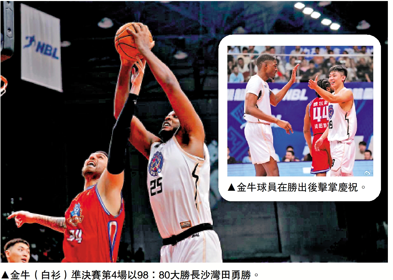 【大公報訊】記者朱家立報道:全國男子籃球聯賽(NBL)季後賽準決賽第四場比賽於昨晚舉行,大比分2:1領先的香港金牛繼續客戰長沙灣田勇勝。憑藉當家球星瓊斯的出色發揮,金牛以98:80大勝對手晉級總決賽,將戰榜首球隊安徽文一。