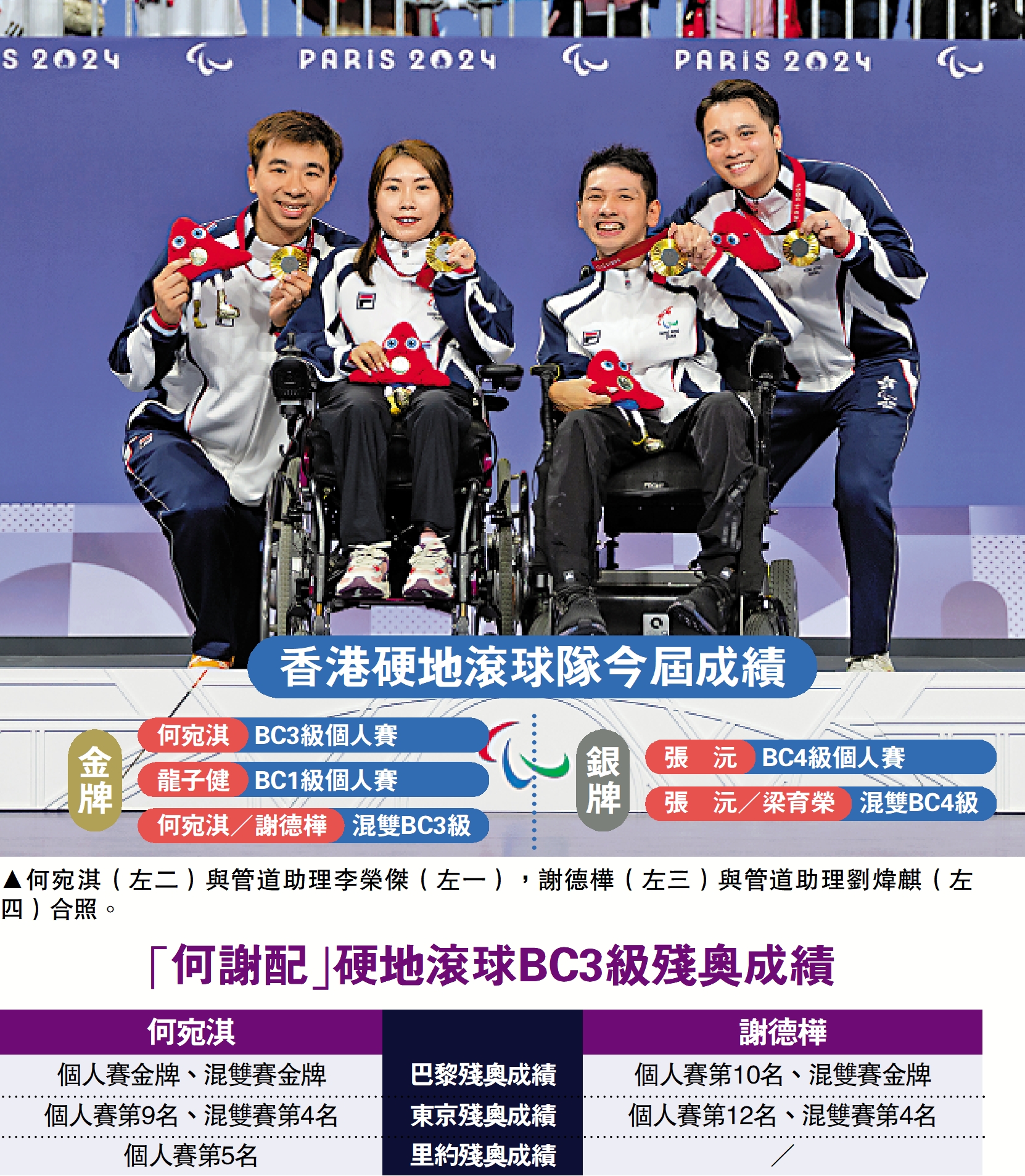 中國香港代表團昨晨再於巴黎殘奧報捷。硬地滾球項目昨日進行最後一日賽事,出戰BC3級混合雙人賽決賽的港隊組合謝德樺/何宛淇以5:3擊敗韓國組合奪金,為港隊在今屆金牌數增至3枚。至於參加BC4級混合雙人賽決賽的另一對港隊組合梁育榮/張沅則以1:6不敵世界排名第一的哥倫比亞,仍能收穫一枚銀牌,香港硬地滾球隊今屆共奪3金2銀。行政長官李家超發文祝賀4名運動員,讚揚4位運動員表現出色、態度專業,他和全港市民皆引以為傲。\大公報記者 張銳