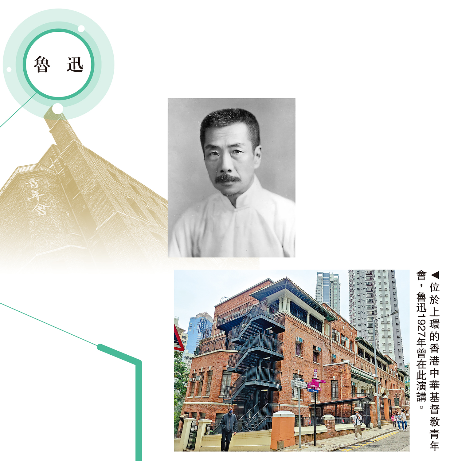 位於上環必列者士街的香港中華基督教青年會(現稱必列者士街會所),曾是1927年魯迅在香港兩次演講的地方。在《魯迅日記》中,就可對此找到一段文字的印證:「雨。晨上小汽船,葉少泉、蘇秋寶、申君及廣平同行,午後抵香港,寓青年會。夜九時演說,題為〈無聲的中國〉,廣平翻譯。」