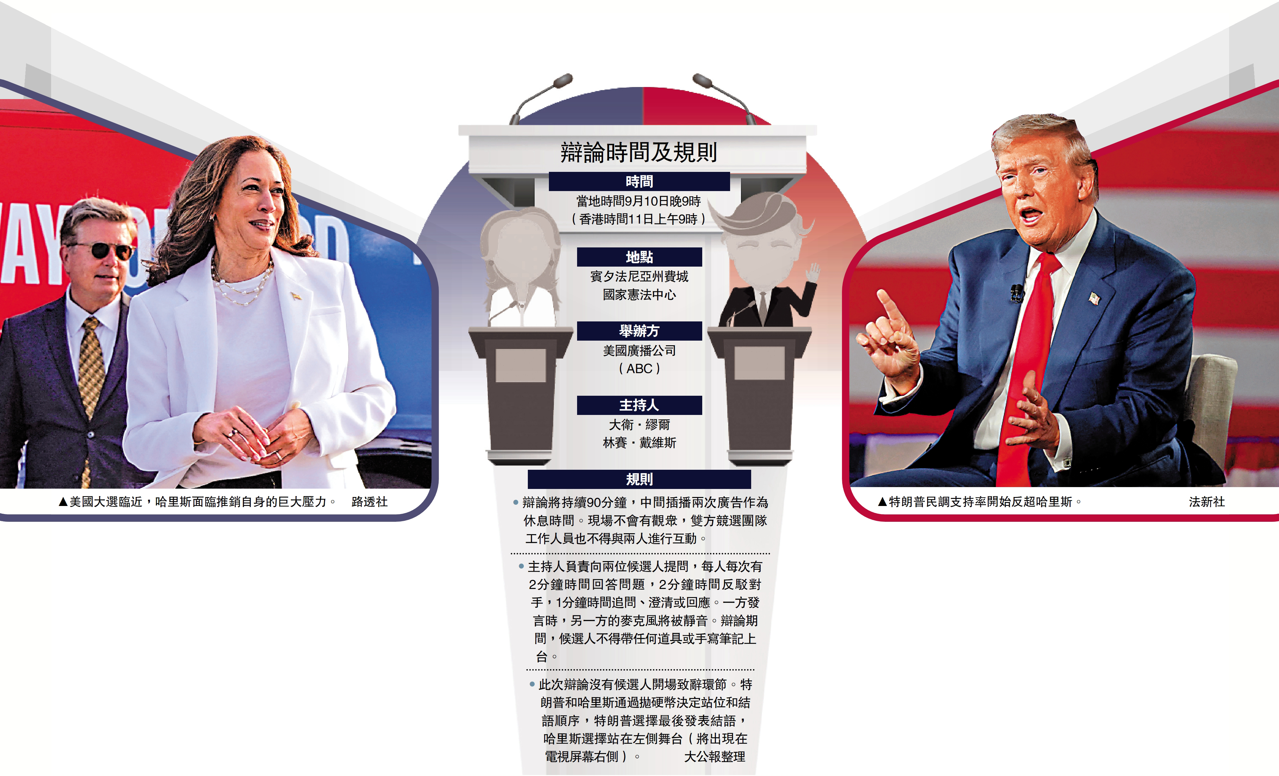 一項最新民調顯示,美國民主黨候選人、副總統哈里斯的「政治蜜月期」似乎已結束,其支持率被共和黨候選人特朗普反超。美媒指出,距離美國大選僅剩8周,兩黨候選人改變選民投票意向的機會已經不多。哈里斯與特朗普於當地時間10日晚9時(本港時間11日上午9時)進行電視辯論,有分析認為,哈里斯面臨「背水一戰」。辯論前幾天,哈里斯在匹茲堡一家酒店接受特訓,特朗普則顯得更加隨性。