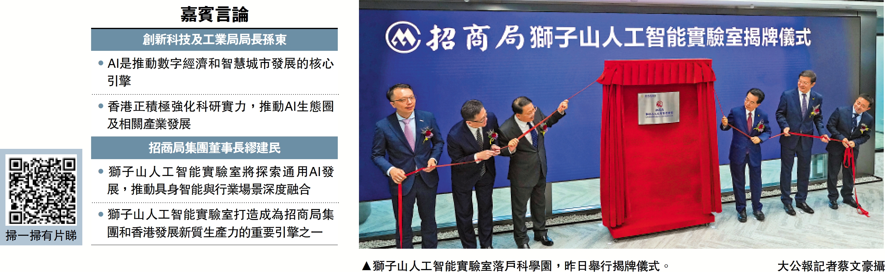 獅子山人工智能實驗室落戶科學園,昨日舉行揭牌儀式,中央政府駐港聯絡辦副主任尹宗華、招商局集團董事長繆建民、創新科技及工業局局長孫東、引進重點企業辦公室執行總裁彭文俊等嘉賓出席儀式。孫東致辭時表示,AI是推動數字經濟和智慧城市發展的核心引擎,香港正積極強化科研實力,推動AI生態圈及相關產業發展。\大公報記者 李潔儀