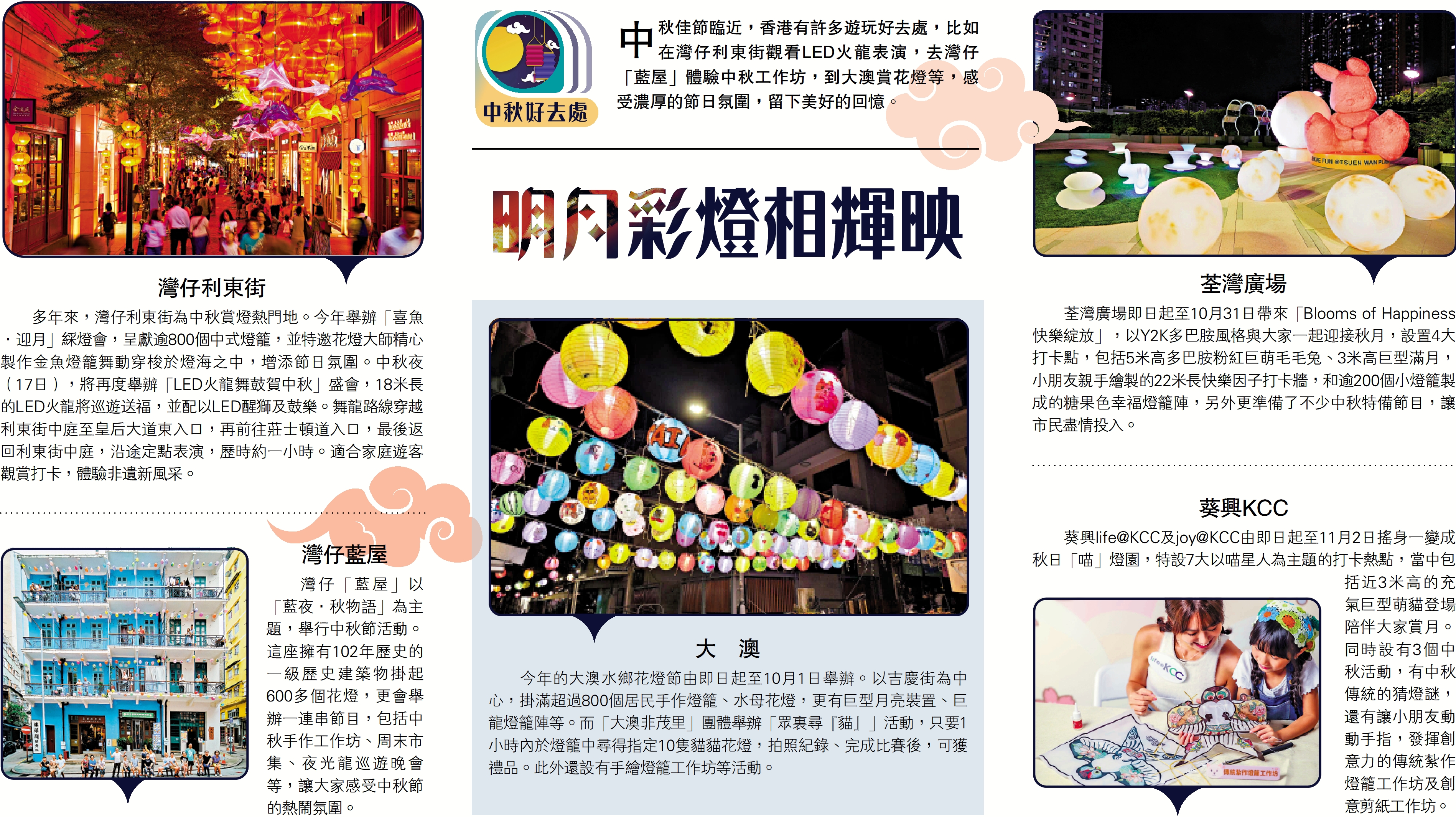 中秋佳節臨近,香港有許多遊玩好去處,比如在灣仔利東街觀看LED火龍表演,去灣仔「藍屋」體驗中秋工作坊,到大澳賞花燈等,感受濃厚的節日氛圍,留下美好的回憶。