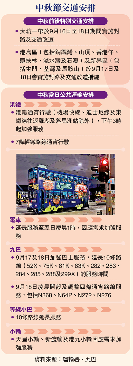 •9月17及18日加強巴士服務,延長10條路線(52X、75K、81K、83K、282、283、284、285、288及299X)的服務時間