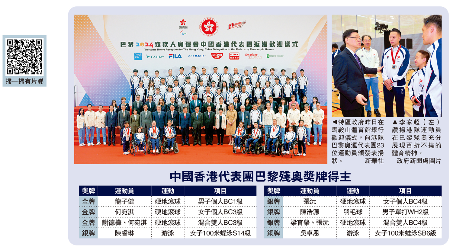 中國香港殘奧代表團在巴黎殘奧會獲得3金4銀1銅共8枚獎牌,佳績令全城鼓舞。特區政府昨日早上在馬鞍山體育館舉行歡迎儀式,由行政長官李家超主禮,向23位運動員頒發表揚狀,肯定運動員在巴黎殘奧會為港爭光。儀式完結後,李家超於禮賓府為代表團設午宴,表彰他們在今屆殘奧會上付出的努力和取得的成就。\大公報記者 朱家立