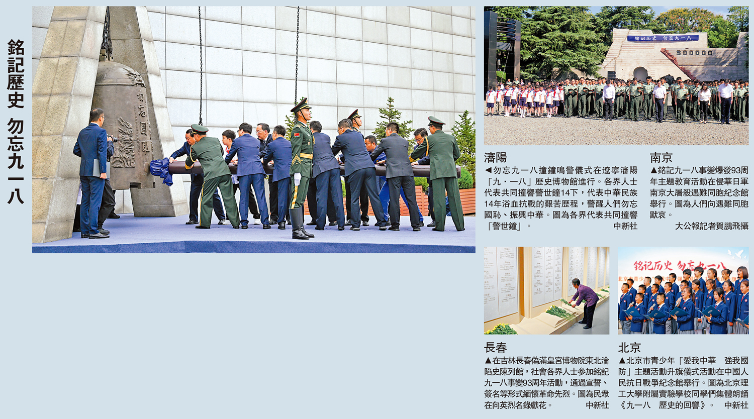 勿忘九一八撞鐘鳴警儀式在遼寧瀋陽「九·一八」歷史博物館進行。各界人士代表共同撞響警世鐘14下,代表中華民族14年浴血抗戰的艱苦歷程,警醒人們勿忘國恥、振興中華。圖為各界代表共同撞響「警世鐘」。\中新社