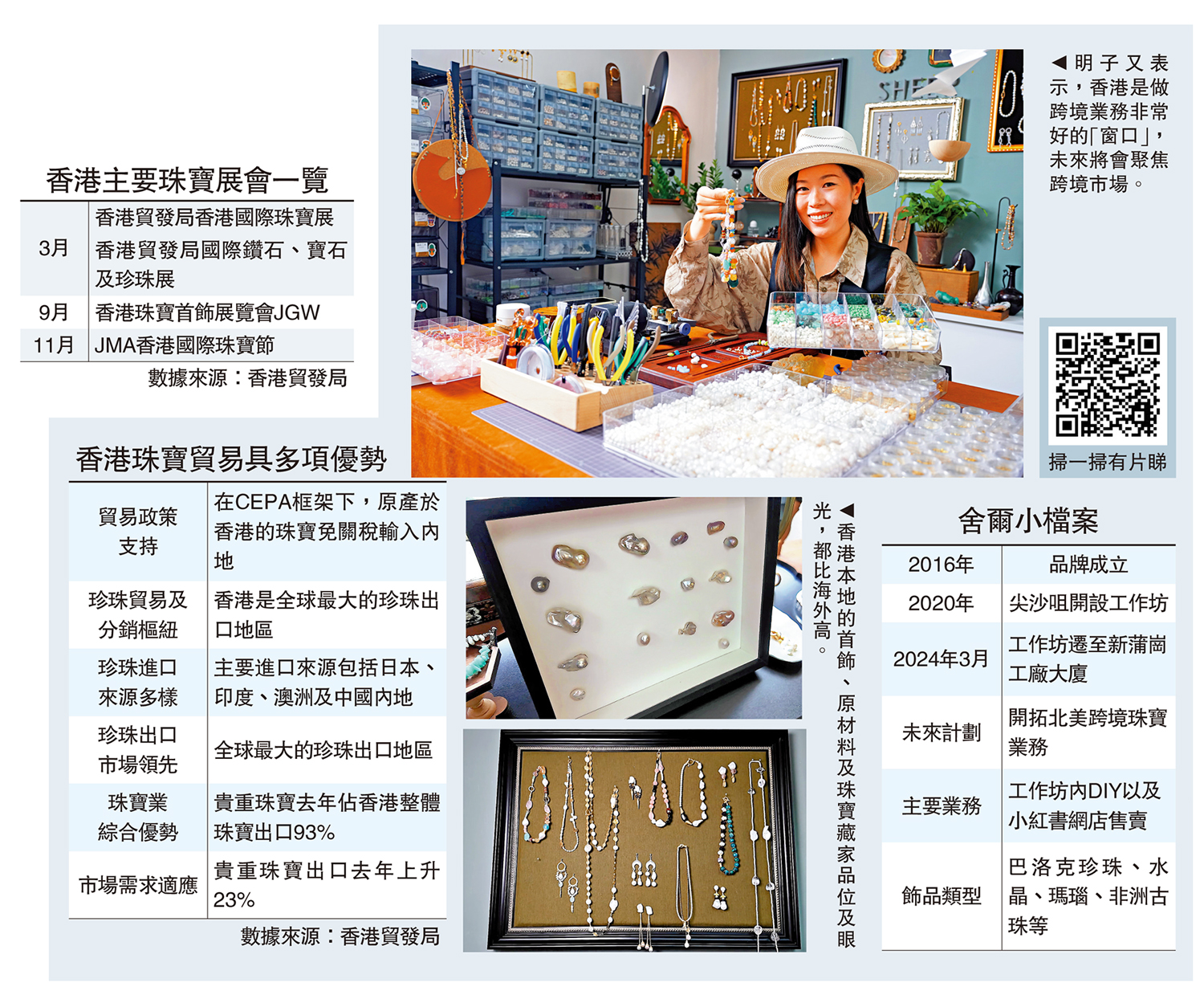 「品牌這個東西,並不是我要做品牌(就成為品牌),而是在其他人眼裏你是不是一個品牌。」作為香港本地珠寶品牌舍爾·Sheer Jewel的聯合創辦人和主理人,明子又(Cassia)在2016年開設線上珍珠首飾售賣平台,疫情期間更逆流而上,在尖沙咀開設以珍珠項鏈設計為主的工作坊(workshop)。她表示,香港是做跨境業務非常好的「窗口」,未來將會聚焦跨境市場,今年初工作坊已遷到新蒲崗的工廠大廈,謀求更長遠發展。\大公報記者 李樂兒(文) 蔡文豪(圖)