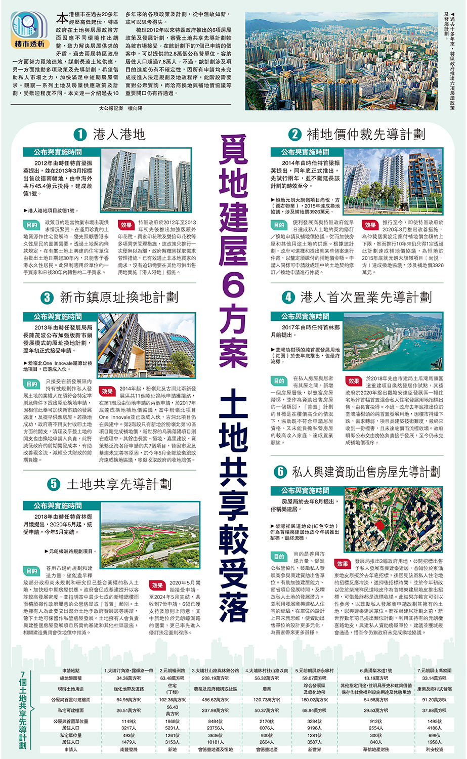 梳理2012年以來特區政府推出的6項房屋政策及發展計劃,察覺土地共享先導計劃較為被市場接受。在該計劃下的7個已申請的個案中,可以提供約2.8萬個公私營單位,容納居住人口超過7.8萬人。不過,該計劃涉及項目的進度仍有不確定性,因所有申請均未完成或進入法定規劃及地政程序,此階段需要面對公眾質詢,而洽商換地與補地價協議等重要關口仍有待通過。\大公報記者 樓向陽