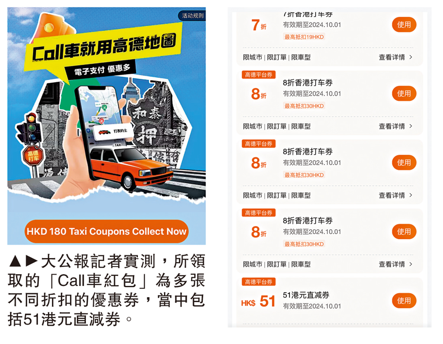 記者以另一個內地電話號碼登入「高德地圖」,以同樣方式領取優惠券,但運氣欠佳,未能取得「51元直減券」或「七折香港打車券」,最終只有六張「八折香港打車券」,每張最高可扣減30港元,合共最高180元折扣優惠,同時只可在香港城市使用,有效期同樣是至今年10月1日。