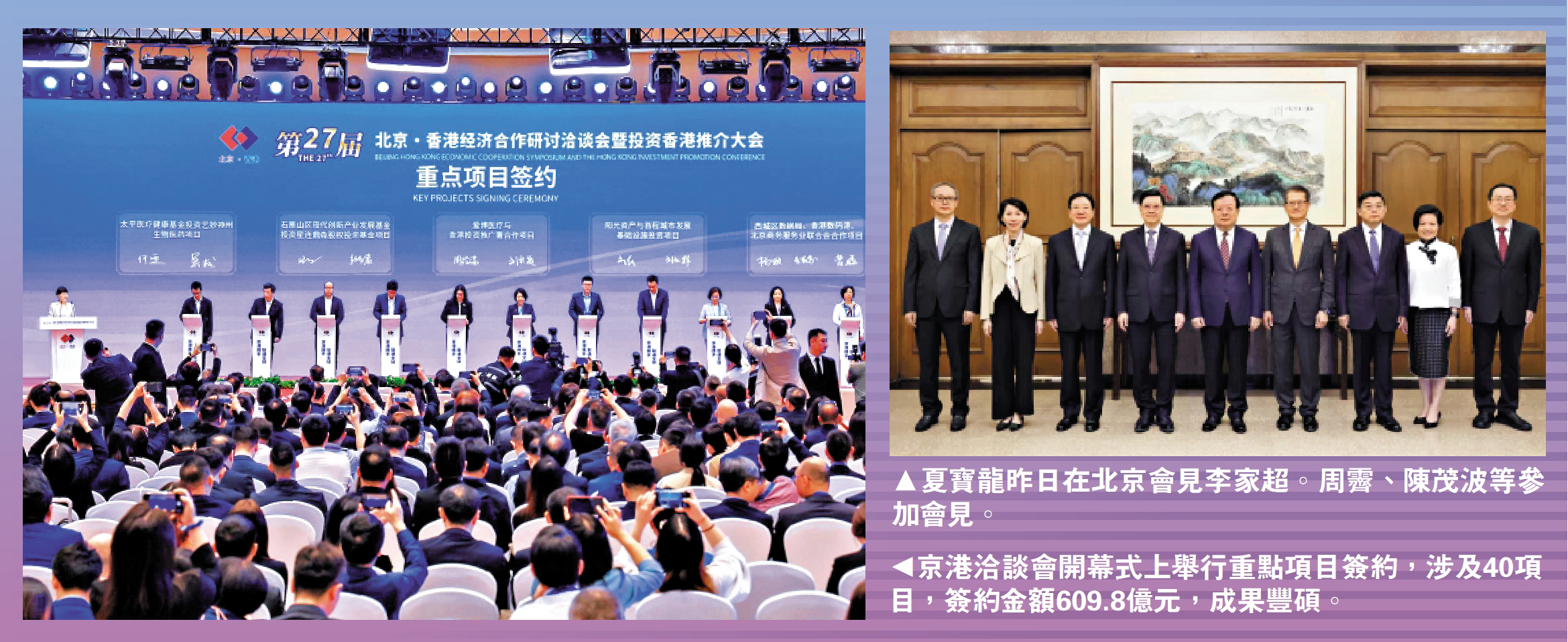 第二十七屆北京·香港經濟合作研討洽談會暨投資香港推介大會昨日在北京中關村國際創新中心開幕,來自京港兩地政府機構、國際商協會、領軍企業和工商界知名人士800餘人參會。會議現場發布雙向投資招商引資項目169個,招商總額416.5億元(人民幣,下同)。涵蓋科技服務、金融、生物科技等12個重點合作領域簽約項目40個,簽約金額609.8億元。