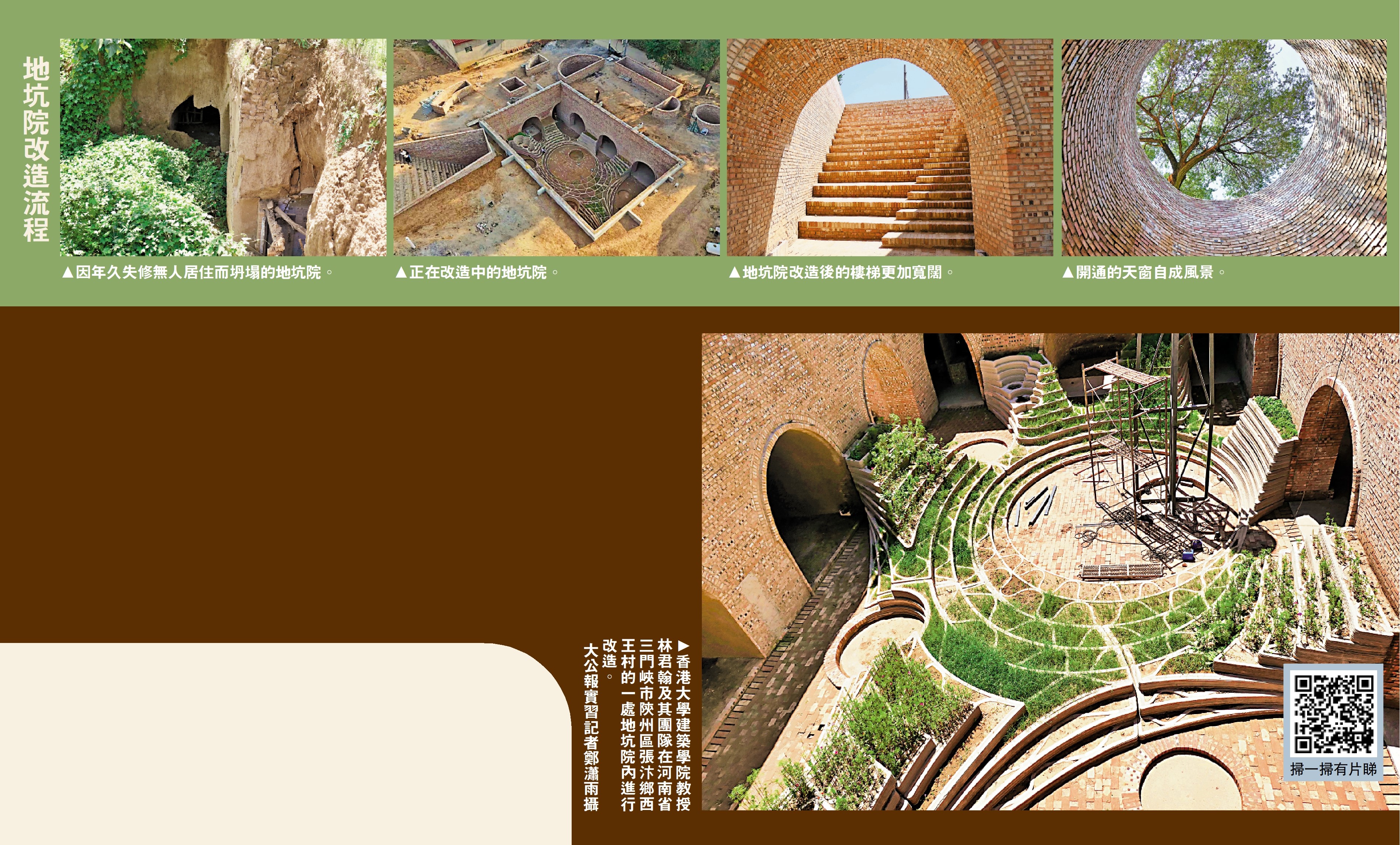 向下開挖,鑿壁而建,遠望去只覺地上平坦開闊,拾級而下,才發現另有乾坤,這就是「見樹不見村,進村不見房,聞聲不見人」的地坑院,又被稱為中國北方的「地下四合院」。地坑院的建造歷史距今已有上千年,如今,在河南省三門峽市陝州區張汴鄉西王村的一處地坑院內,這個被列進國家級非物質文化遺產名錄的營造技藝正在與香港大學建築學院教授林君翰及其團隊所帶來的現代建築理念和技術相互碰撞、交融,迸發出新的活力,釋放大價值。\大公報記者劉蕊 實習記者鄭瀟雨、楊玉涵