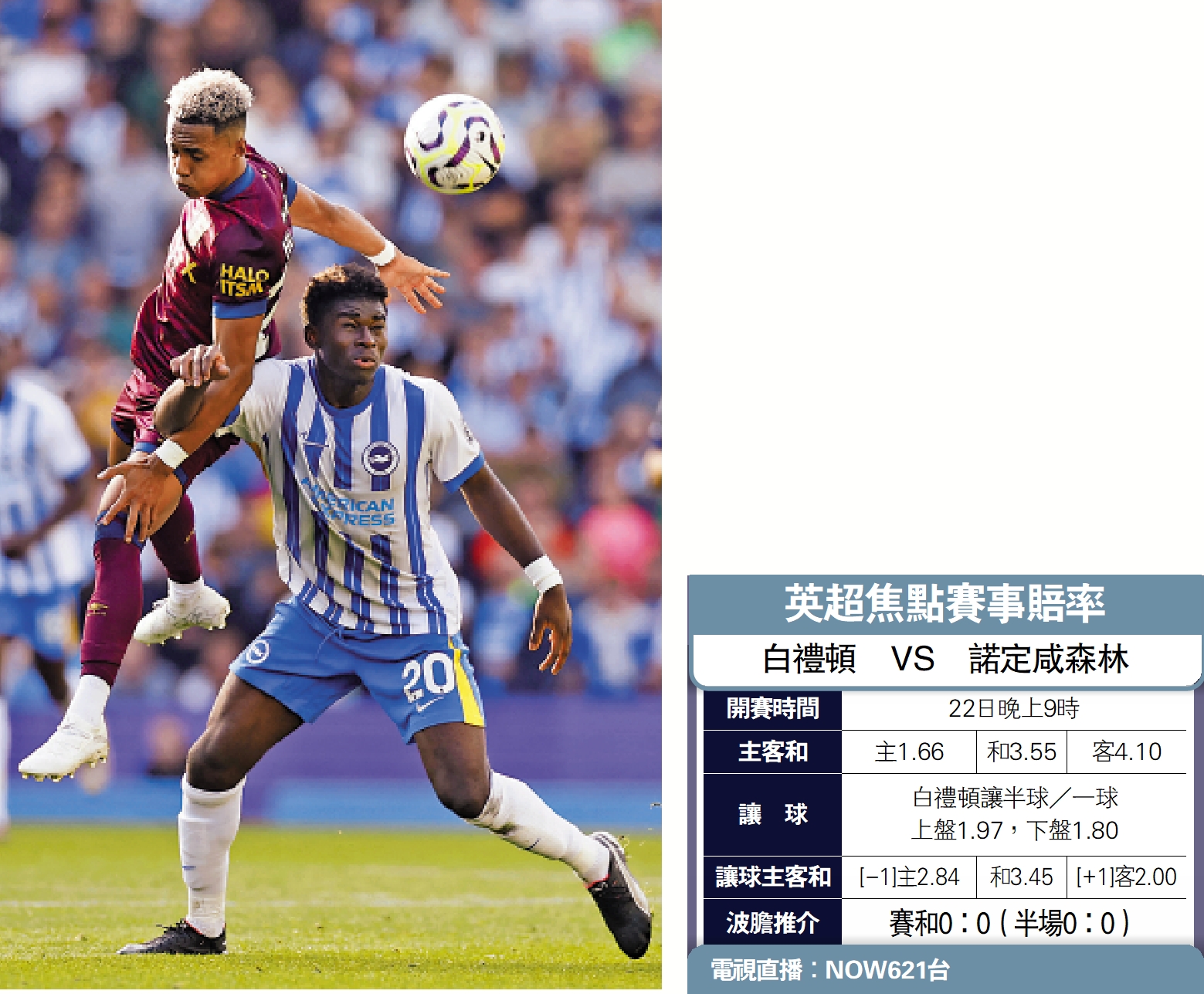 白禮頓開季連勝愛華頓及曼聯予人驚喜,之後賽和阿仙奴都保持水準,上仗主場被升班馬葉士域治悶和後,仍以兩勝兩和錄得不敗,不過火力有所減弱,主要是老將韋碧克、新兵佐真尼魯達及日本好手三笘薰失機頻頻,預計他們今仗即使主場出擊,也不敢貿然向狀態大勇的森林撲擊,或寄望先求穩守中爭取勝利。