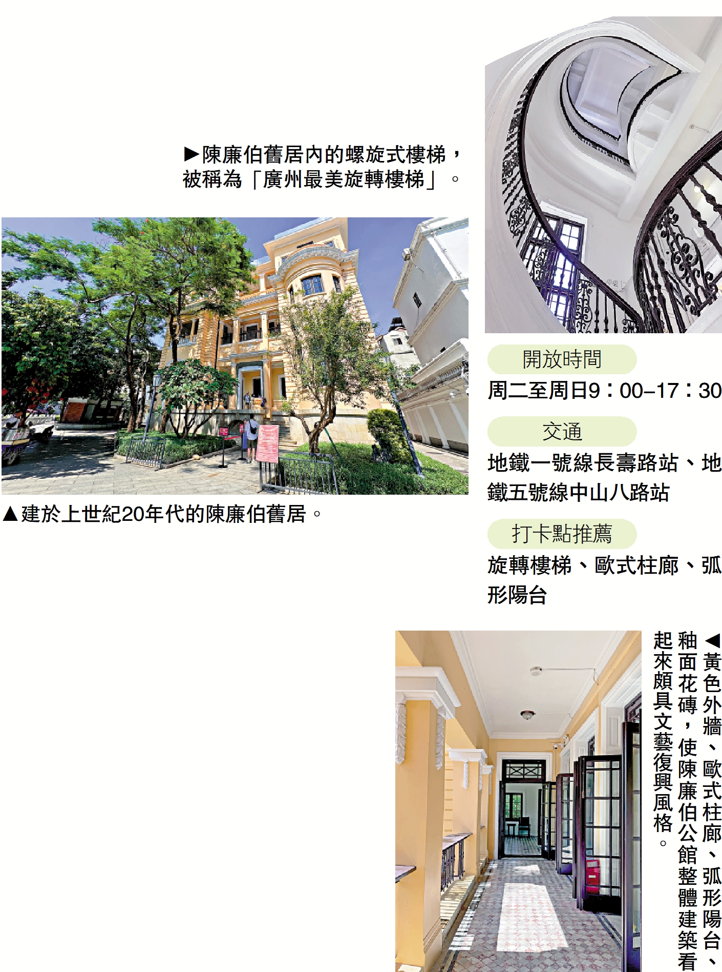 有「廣州最美旋轉樓梯」之稱的螺旋式樓梯,就位於陳廉伯舊居。這是一座仿歐式風格磚木結構三層樓房,建於上世紀20年代。黃色外牆、歐式柱廊、弧形陽台、釉面花磚,使陳廉伯公館整體建築看起來頗具文藝復興風格;門楣、窗格、隅石、大檐口等都做工精緻,還有具巴洛克特色、線條優美的螺旋樓梯,無一不訴說着主人的烜赫身份——陳廉伯是清末出口巨商,擁有十家銀行和無數當舖,是當時世界上最有實力的華人金融家之一。
