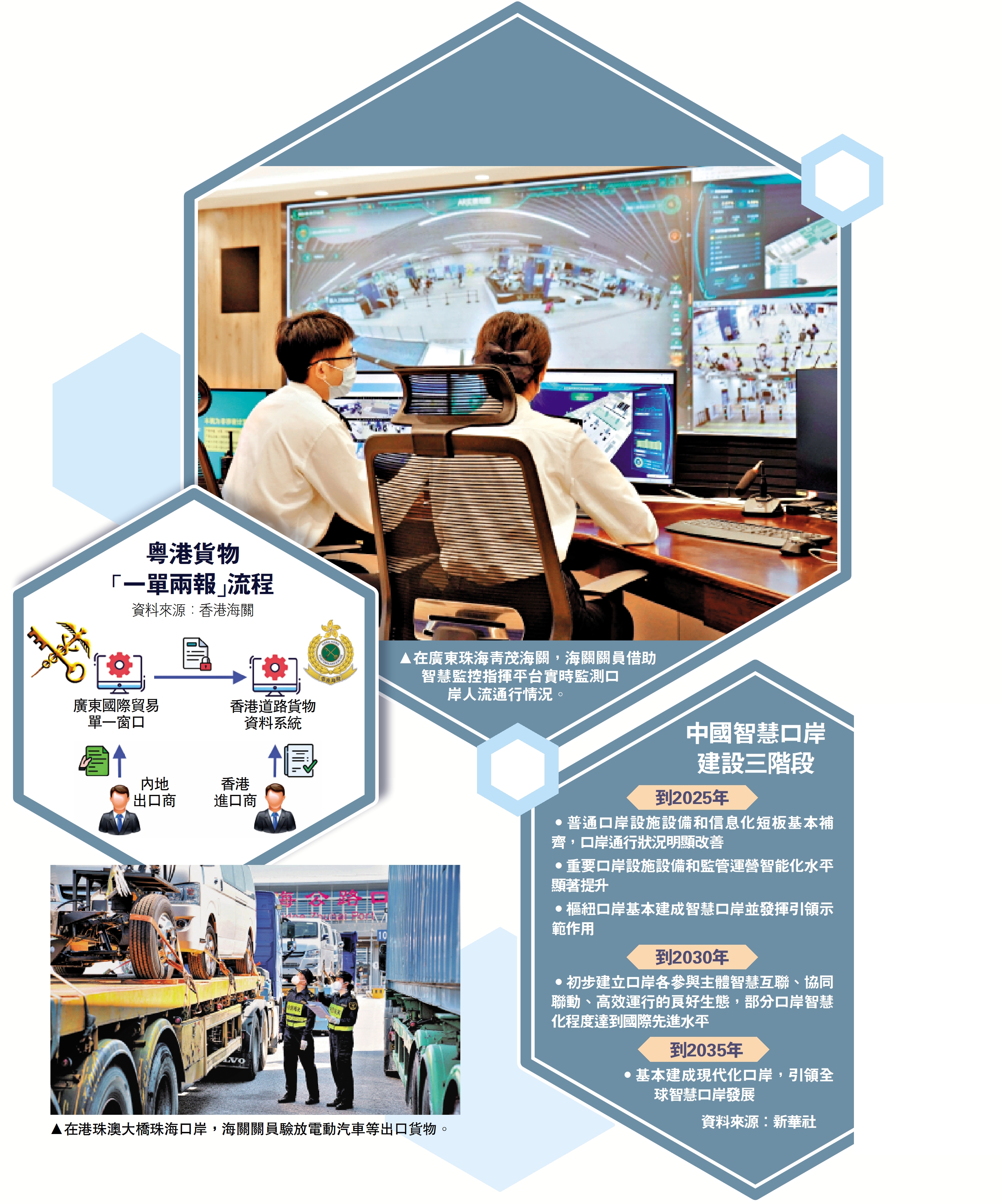 海關總署、國家發改委、交通運輸部等九部門近日聯合公布《關於智慧口岸建設的指導意見》(下稱《指導意見》),明確17重點,加快口岸數字化轉型和智能化升級,到2035年基本建成現代化口岸,引領全球「智慧口岸」發展。其中提出,支持「灣區跨境通」建設,推進內地和香港、內地和澳門貨物「一單兩報」。記者22日從廣東省口岸部門獲悉,粵港「一單兩報」應用已正式上線運行,香港企業在港錄入數據必填項由9項減少為0項,提升粵港通關貿易便利化水平。有學者表示,建設「灣區跨境通」,有利於強化香港作為國際物流樞紐的地位。/大公報記者 方俊明廣州報道