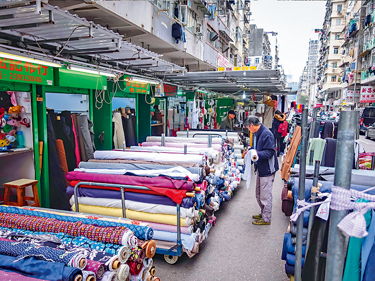 深水埗又是廉價成衣和日用品的集中地。鴨寮街有不少二手貨地攤。至於布疋店、絲帶店、皮革店、玩具店,真是成行成市。在汝州街、基隆街一帶,布料彩帶珠子堆滿店前,真是應接不暇、眼花繚亂。