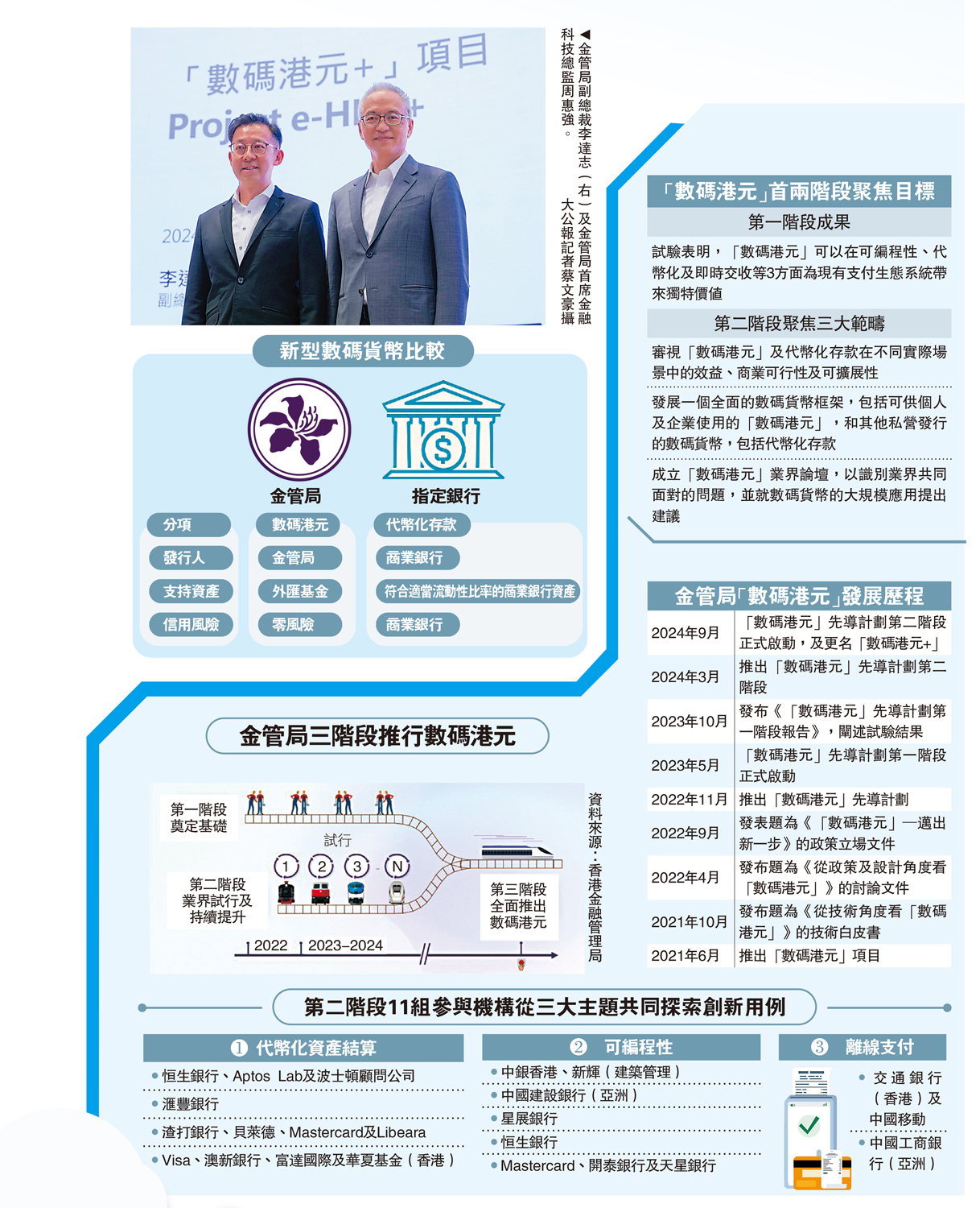 金管局啟動「數碼港元」先導計劃第二階段,11組不同行業的參與機構就三大主題進行試驗,包括代幣化資產結算、可編程性和離線支付,進一步探索可供個人及企業使用到的新型數碼貨幣的創新用例。金管局表示,將在未來12個月與入選機構緊密合作,並在2025年底前公布主要研究成果。同時,基於目前數碼人民幣已經廣泛發行,甚至已經能接通「轉數快」系統,即使將來推出「數碼港元」,要連接數碼人民幣亦無需太多場景測試。\大公報記者 蔣去悄