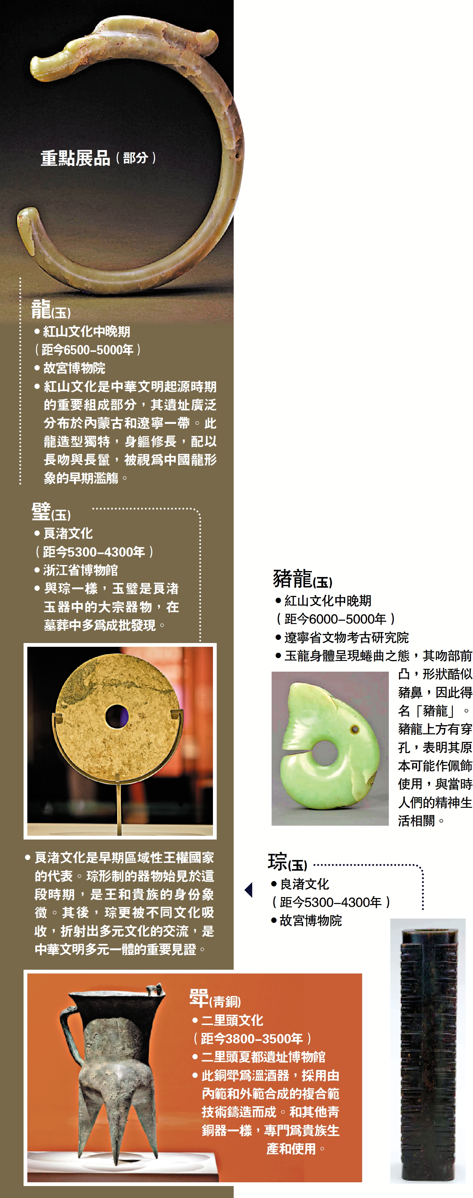 •良渚文化是早期區域性王權國家的代表。琮形制的器物始見於這段時期,是王和貴族的身份象徵。其後,琮更被不同文化吸收,折射出多元文化的交流,是中華文明多元一體的重要見證。