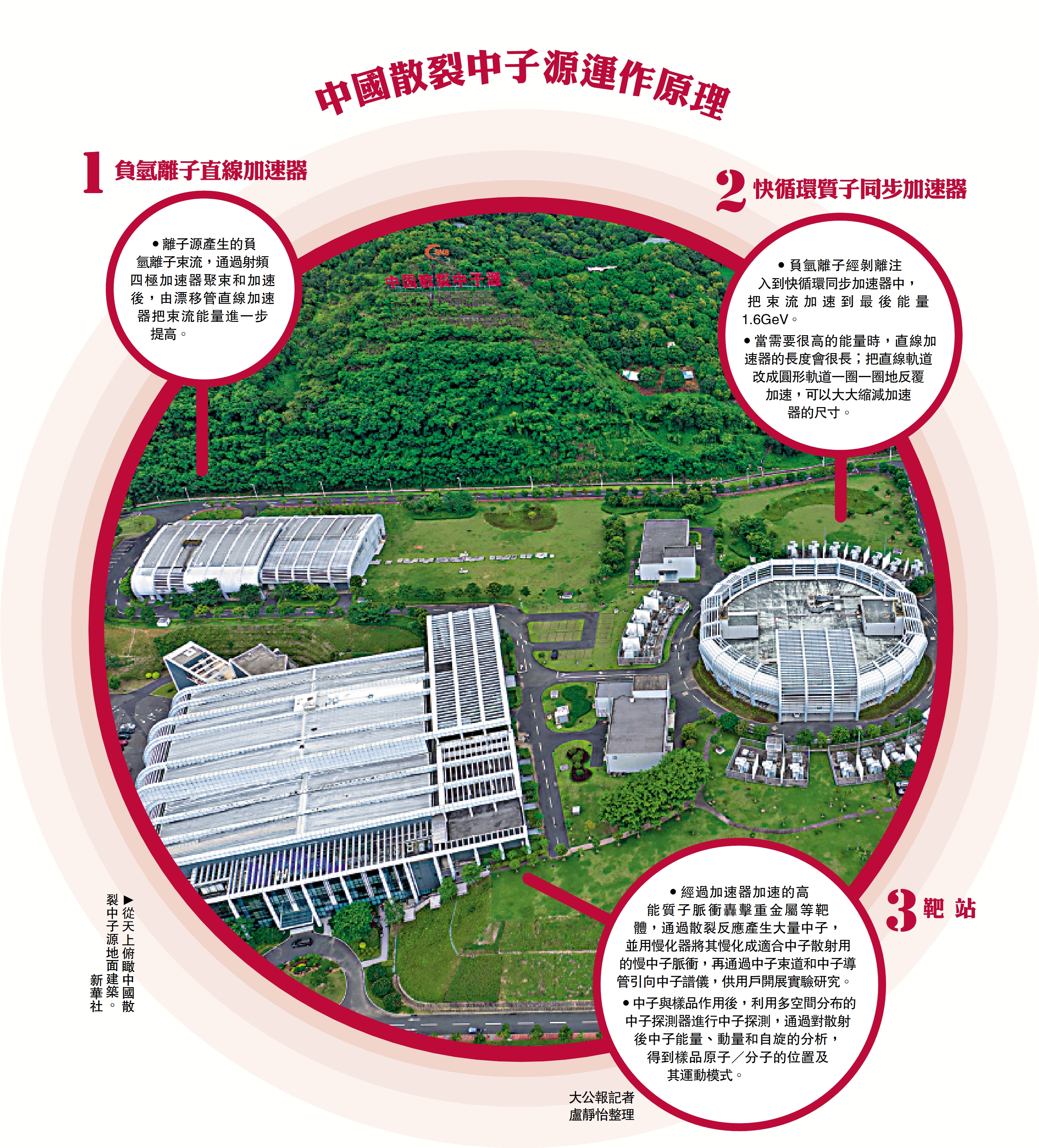 •經過加速器加速的高能質子脈衝轟擊重金屬等靶體,通過散裂反應產生大量中子,並用慢化器將其慢化成適合中子散射用的慢中子脈衝,再通過中子束道和中子導管引向中子譜儀,供用戶開展實驗研究。