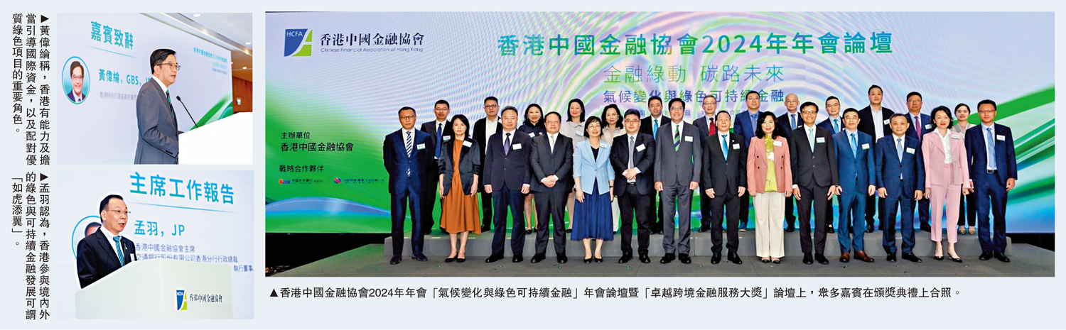 當前全球面臨氣候變化所帶來的挑戰,香港中國金融協會主席孟羽表示,綠色與可持續金融能夠引導資本和資金配置,是適應氣候變化的重要手段。財政司副司長黃偉綸則指出,香港在綠色債券、綠色能源等方面取得顯著成效,進一步鞏固香港作為國際金融中心的地位,並強調應對氣候變化挑戰不能單靠特區政府,希望與各業界攜手合作。\大公報記者 蔣夢宇