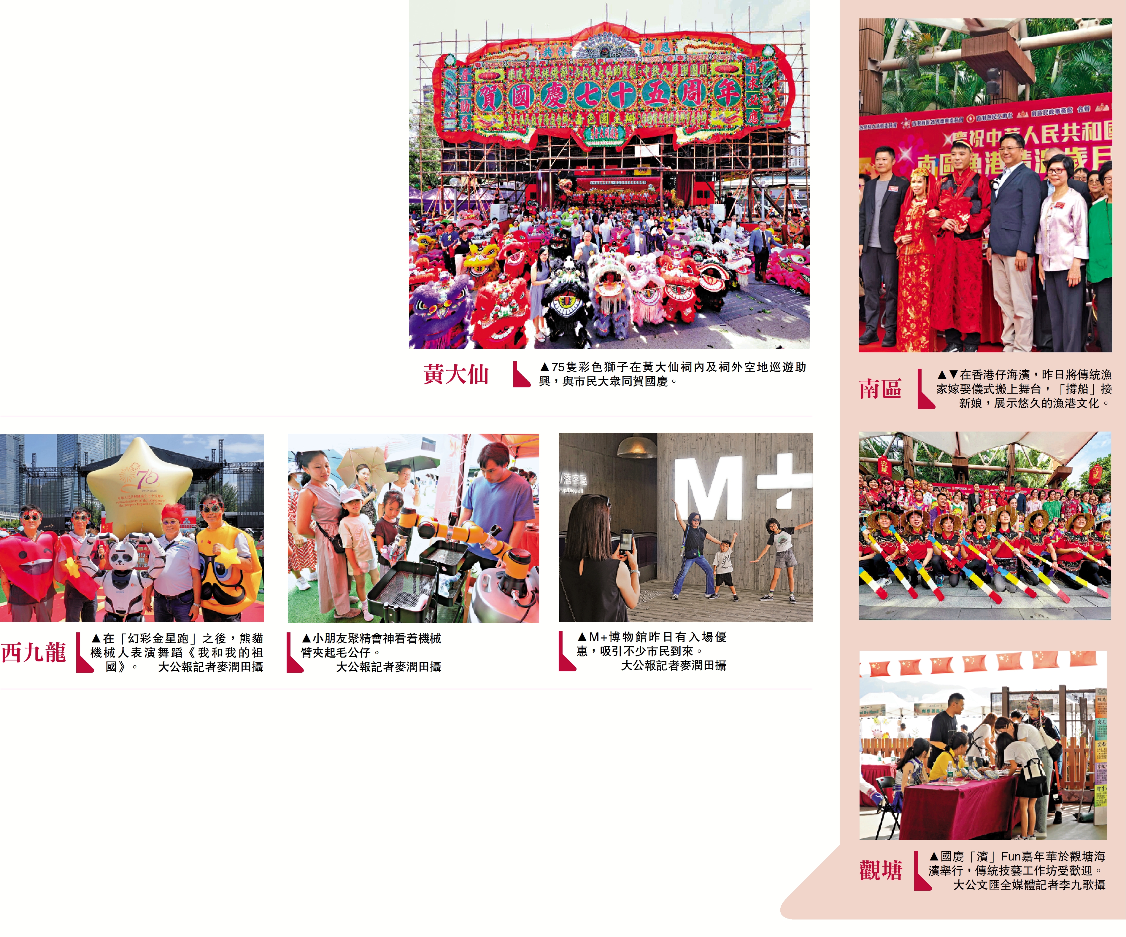 「國慶同行 油尖旺 跑出個未來」千人活動在西九文化區舉行、「南區漁港情濃歲月之漁家嫁娶」在香港仔海濱上演,「國旗快閃耀香江」唱響維港,黃大仙祠外有「七十五瑞獅賀國慶」,西貢區舉行「綜藝匯演」,觀塘海濱花園舉行「國慶『濱』Fun嘉年華」……區區有亮點,18區市民樂也融融。\大公報記者 陸九如 李清